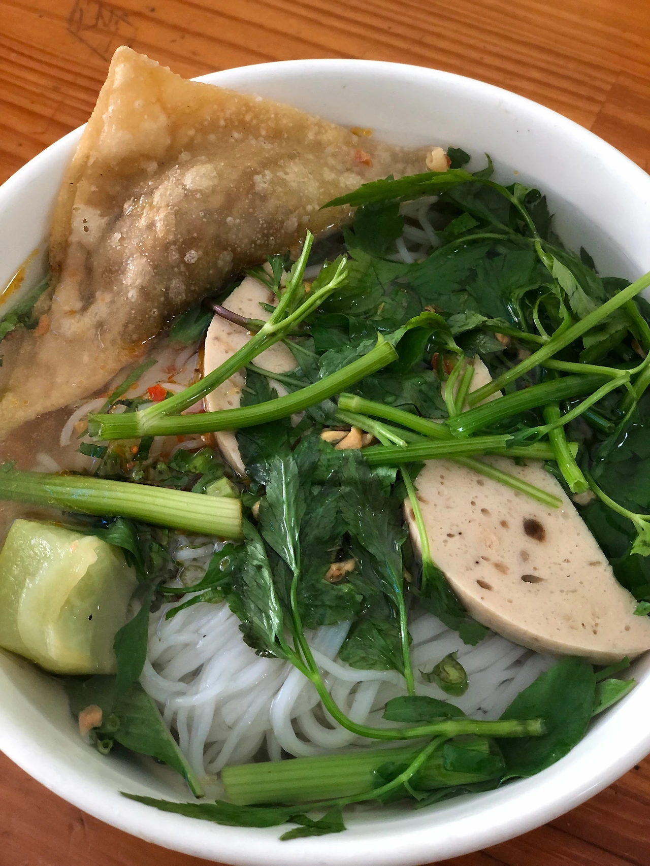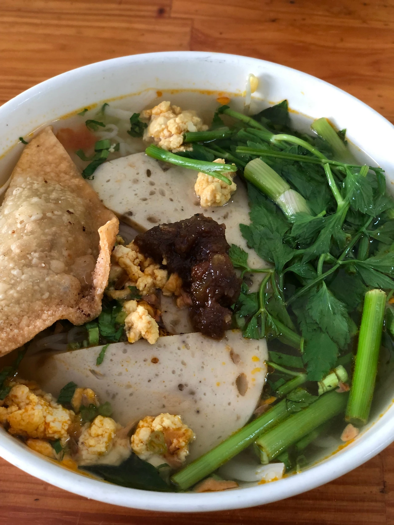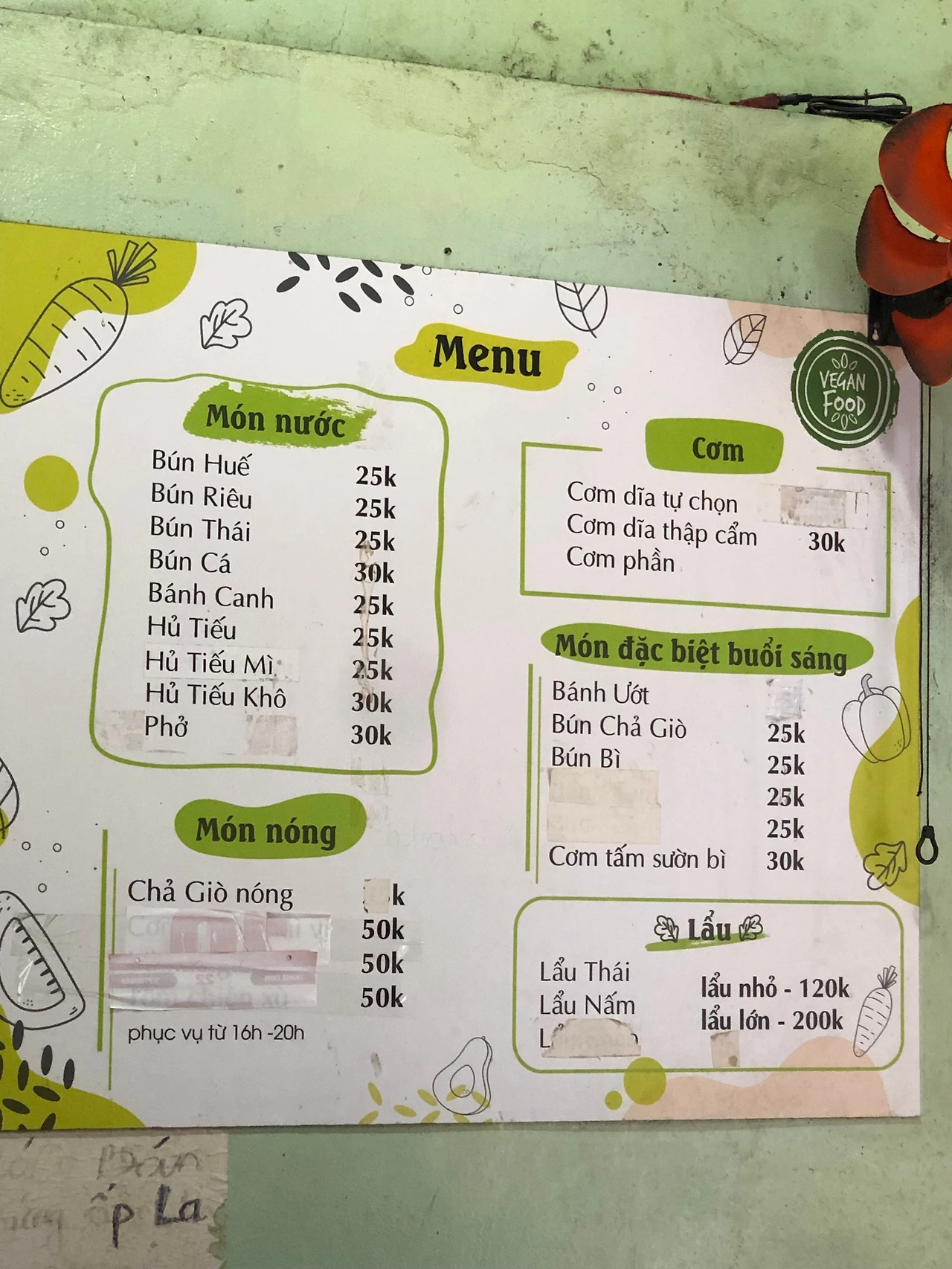 처음 이 식당에 다녀온 이후 메뉴에 있는 모든 국수를 맛보겠다는 일념으로 매일 아침마다 국수를 먹으러 갔다. 베트남어는 알파벳이라 성조는 망해도 대충 뭐가 뭔지 읽을 수는 있다. 내가 벽에 붙은 메뉴 사진을 찍어 손가락으로 가리키며 국수를 주문하면 사장님이 소리 내 읽으며 주문을 받았다. 사장님과 친해져서 우리가 가면 사장님이 알아보고 손을 흔들어주셨다. 국수는 한 그릇에 25-30k동(약 1500원)인데 채소, 면, 국물, 대체육에 튀긴 완탕까지 올려준다.
