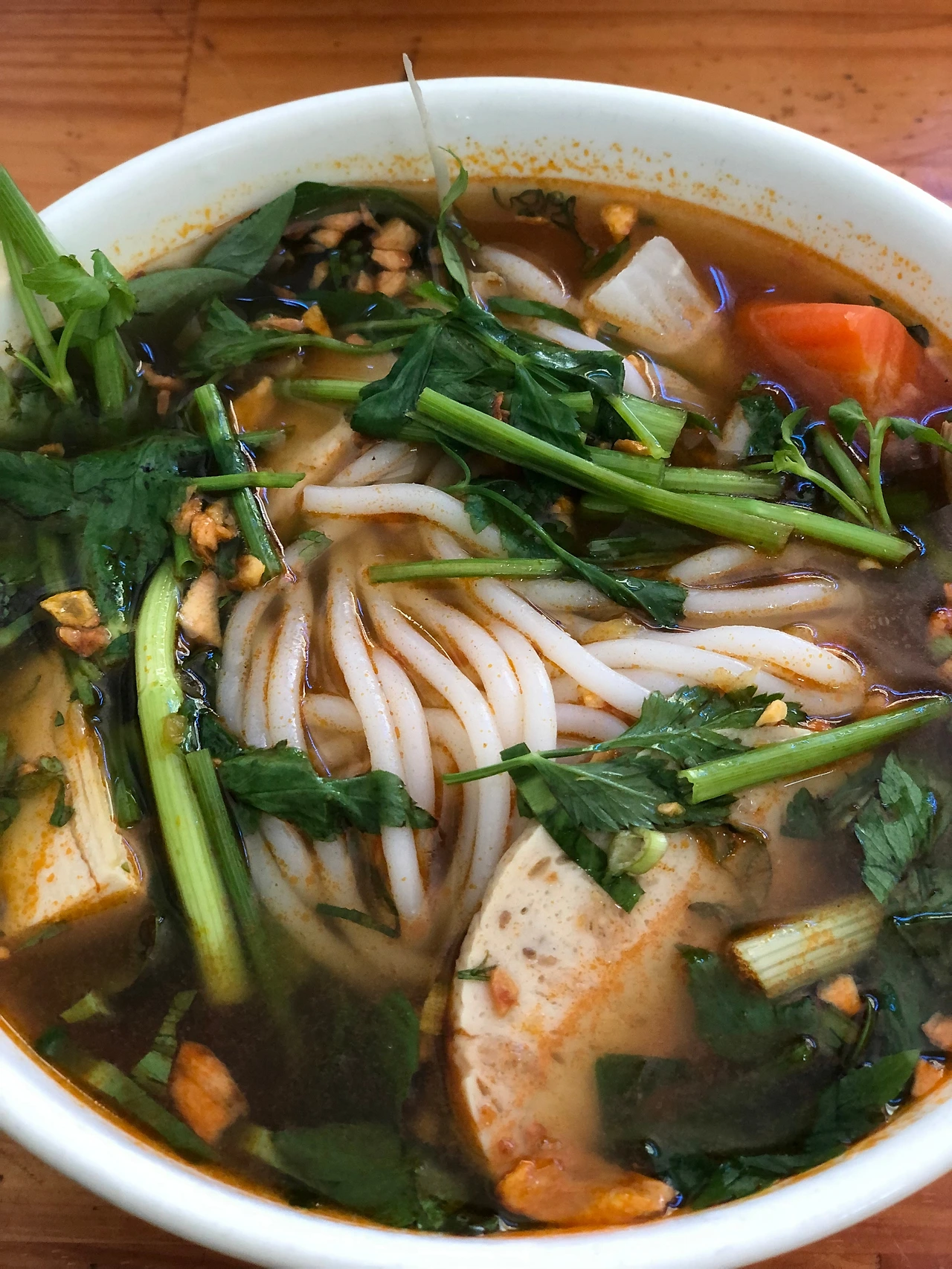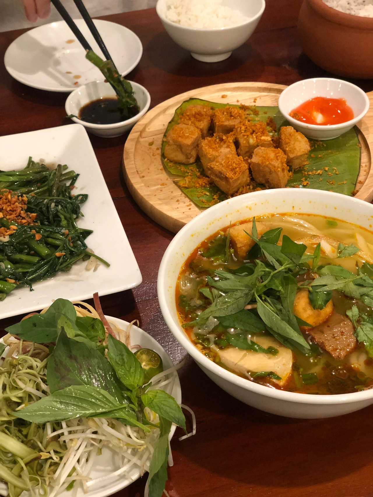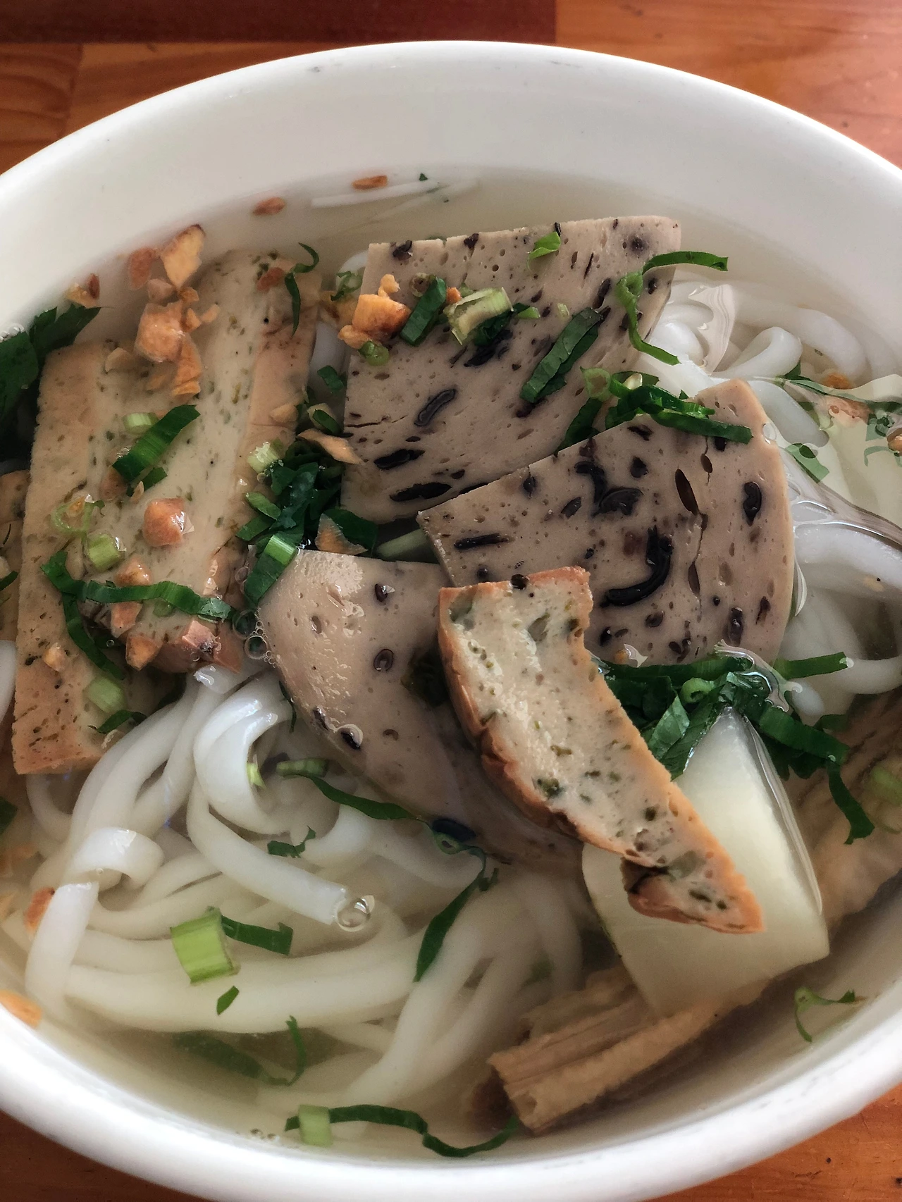 처음 이 식당에 다녀온 이후 메뉴에 있는 모든 국수를 맛보겠다는 일념으로 매일 아침마다 국수를 먹으러 갔다. 베트남어는 알파벳이라 성조는 망해도 대충 뭐가 뭔지 읽을 수는 있다. 내가 벽에 붙은 메뉴 사진을 찍어 손가락으로 가리키며 국수를 주문하면 사장님이 소리 내 읽으며 주문을 받았다. 사장님과 친해져서 우리가 가면 사장님이 알아보고 손을 흔들어주셨다. 국수는 한 그릇에 25-30k동(약 1500원)인데 채소, 면, 국물, 대체육에 튀긴 완탕까지 올려준다.