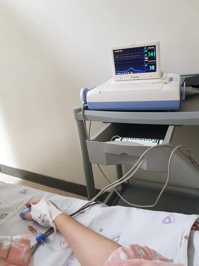 자궁수축(진통의 강도)를 보여주는 모니터기. 진통이 올 때마다 파란 선이 솟아오르는데, 강도가 셀수록 산도 더 높아진다.