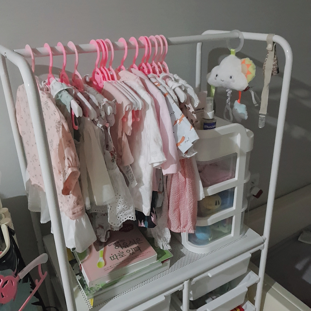 2. 답답하기 쉬운 원룸 구조상 배치를 여러 번 바꿨다. 당시 (빌트인 옷장을 제외하고) 우리 집에서 움직일 수 없었던 가구는 TV장과 저상형 퀸 침대, 책장뿐이었다. 아기 침대는 밸크로로 되어 매트로 넓게 활용할 수 있는 범퍼형 침대를 구입해서, 침대로 쓰기도 하고 매트로 사용하기도 했다. 트롤리와 아기 옷 행거도 바퀴가 달려 있어 안전장치를 해제하면 어디로든 이동이 쉬운 제품을 사용했다.
