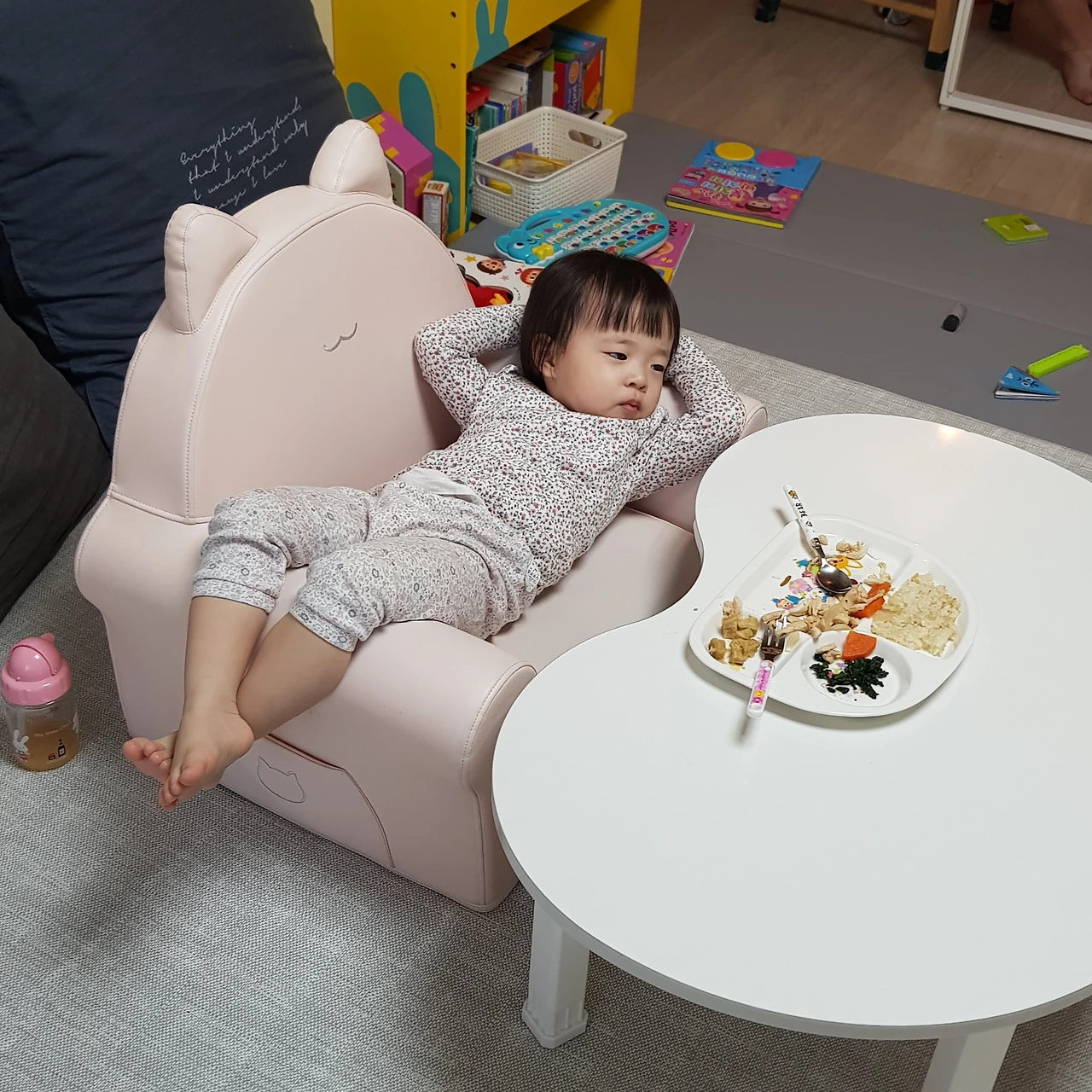 25개월에 어린이집을 보낸 것도 '집에서 다 해줄 수 없는 다양한 음식을 접하고 친구들과 함께 밥 먹는 경험을 하면 좀 나아지지 않을까?' 하는 생각에서였다. 다행히 자기보다 잘 먹는 친구들을 보며 자극을 받았는지, 28개월이 된 요즘은 혼자서 숟가락을 들고 제법 야무지게 먹는다. "맛있다!"라는 표현도 한다. 하지만 어린이집에서도 자기가 못 먹는 반찬이 나오면 오로지 밥만 싹 비우고 자리를 뜬다.