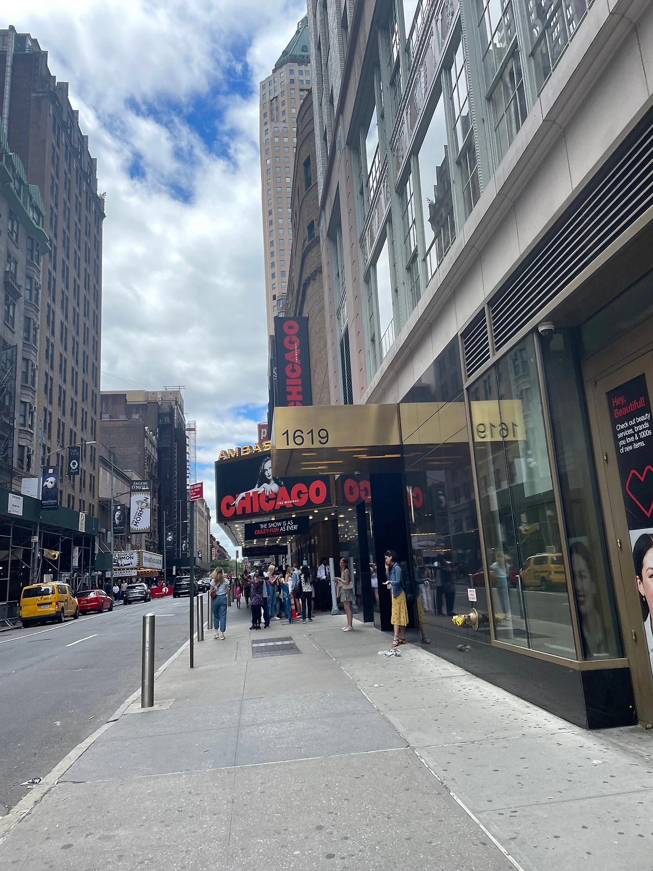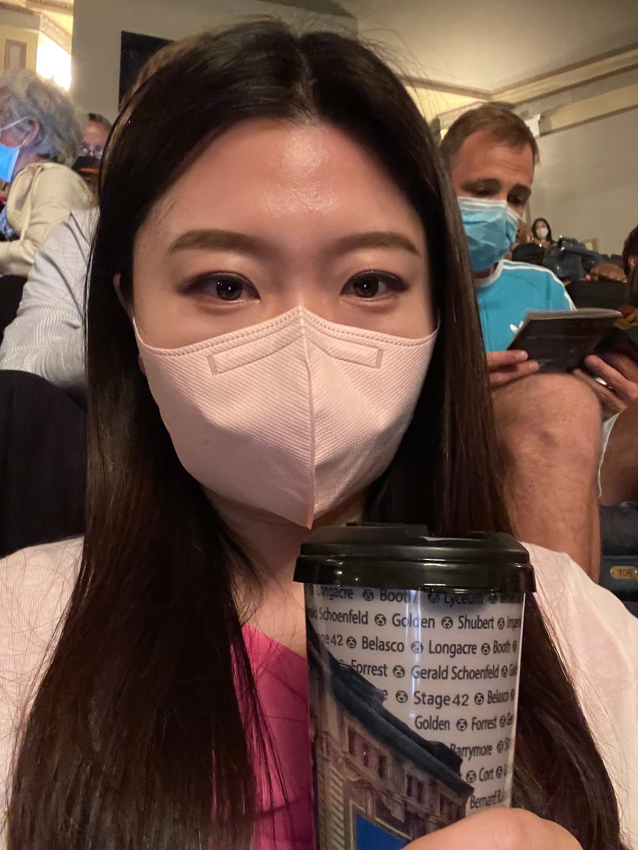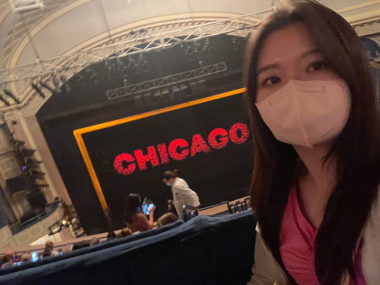 오전에 모마에서 시간을 보내고 극장으로 향했다. 생각보다 모마에 오래 있어서 밥 먹을 시간이 마땅치 않았다. 조금 일찍 도착했는데도 극장 앞에는 사람들이 줄을 서 있었다. 기다리는 내내 분위기는 유쾌했다. 혼자 시카고 간판이 보이게 셀카를 찍으려고 노력하고 있는데 인심 좋아 보이는 아주머니가 말을 건넸다. “찍어줄까?” 덕분에 사진도 잘 찍었다. (이 아주머니는 조금 이따 다시 등장한다.) 입장을 앞두고는 직원이 마스크를 쓰라고 안내했다. 여기서 조금 놀라운 장면을 목격했다. 사람들 중 일부가 마스크가 없다고 하니 직원이 웃으면서 마스크를 가져다 줬다. 한국은 마스크를 써야 할 공간에 마스크를 가져오지 않으면 그 당사자에게 잘못이 있다는 분위기다. 그런데 뉴욕에선 달랐다. 마스크를 안 쓰는 게 일반적이니 마스크를 쓰라고 요구하는 곳에서 조금 더 관대한 모습을 보였다.
