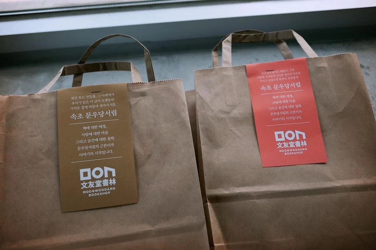 그리고 바로 건너편에 있는 '문우당서림'에 갔다. 문우당 서림은 정말 내부 인테리어에 박수를 친다. 벽을 빼곡하게 채운 색색깔의 책 구절들은 '여기가 포토존이야'라고 말해주는 듯했고, 2층에 올라가면 은밀하게 만날 수 있는 독립 서적 코너도 좋았다. 함께 있는 굿즈들도 너무나 '속초'와 '문우당서림' 스러워서 도대체 뭘 사야 내가 돌아가서 후회하지 않을 수 있을까를 수십 번 고민하게 되었다. 서점의 간판 로고부터 인스타그램까지 그리고 책을 살 때 포장해주는 방법 (원하는 띠지로 둘러주신다)까지 정말 하나의 실로 꿰어져 있는 듯해서 책을 사랑하는 사람이라면 꼭 한번 들렀으면 하는 곳. 나는 이곳에서 함께 간 친구와 서로에게 선물할 책을 한 권씩 사서 선물했다. 내가 선물 받은 책은 김영하 작가의 '여행의 이유' 동네서점 판! 속초를 사랑하게 된 이유, 그리고 또 가고 싶어 진 이유. 이 서점들이 큰 몫을 했다. 그리고 시간이 맞지 않아 못 가본 서점들에 미련이 많이 남아 또 가봐야겠다는 생각을 많이 했더랬다.