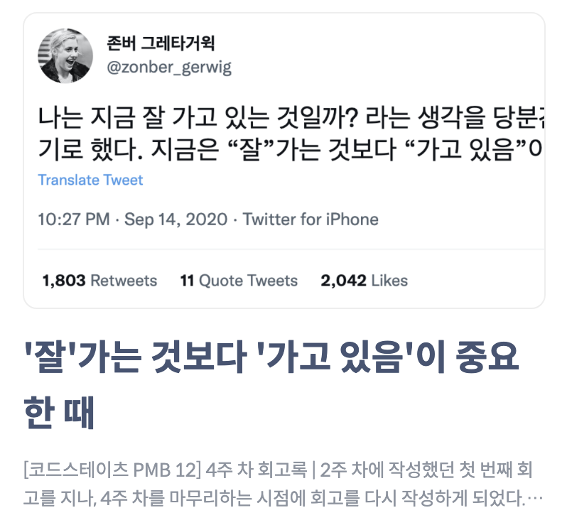 모든 순간이 즐겁지만은 않았다. 나는 때마다 허덕였다. 가끔씩 동기들과의 차이가 크게 느껴져서 숨이 막히는 순간들도 있었다. 나는 아직 다룰 수 있는 툴이 없는데, 수업 내용을 익히는 것만으로도 벅찬데, 이미 현업에서 경험해봤거나 사이드 프로젝트로 경험해본 사람들이 제법 있었다. 위축되는 순간들이 있었다. 개인적인 사정으로 과제는 밀리기 시작했고, 한 번 밀린 과제는 수습하기 어렵게 눈덩이처럼 늘어났다. 그러다가 문득 의문이 들었다. '나 지금 제대로 하고 있는 게 맞나?' 이런 생각에 잠식될 즈음, 트위터에서 이 글을 우연히 보았다. (아마 트친분이 리트윗 해주신 듯)