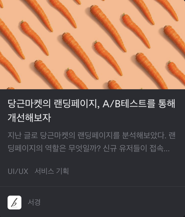 그렇다면 실제로 당근마켓은 어떻게 실험을 진행하고 있을까? 테크 블로그를 통해서 당근마켓이 어떻게 A/B테스트를 진행하는지 확인할 수 있었다. 당근마켓이 1주일에 1개 실험할 수 있도록 설계해놓은 실험 방법을 따라 랜딩페이지 개선을 위한 A/B테스트를 위한 실험을 설계해보자. 뚝딱!