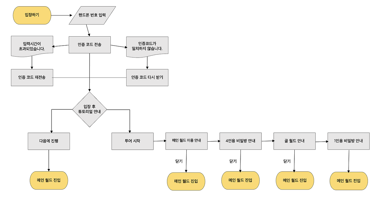 태그룸은 별도의 아이디 없이 휴대폰 번호 인증을 통해 로그인할 수 있다. 입장 후에는 처음이든 아니든 튜토리얼 안내가 뜨게 되며 바로 진행할지, 튜토리얼을 진행할지를 결정해야 한다. (도서관장의 안내멘트라 유쾌하다) 튜토리얼을 진행하지 않는다면 바로 메인 월드로 들어가게 되고, 튜토리얼을 진행한다면 4개의 안내 콘텐츠를 보고 나면 메인 월드에 입장하게 된다.