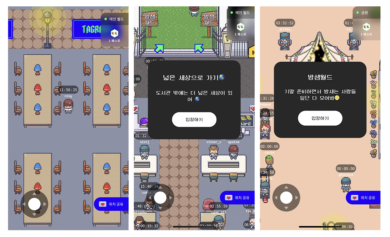 여기서 말하는 메인 월드가 도서관 모드라 앉을자리를 찾아 앉으면 된다. 이 외에도 밤샘 월드, 마이 하우스, 각 직군별 집이 있어서 같은 목표를 향해 공부하는 사람들끼리 동질감(?)을 느낄 수 있다. 아기자기한 디자인의 공간들이 많고, 늦은 시간까지 있는 사람들이 많아서 괜히 위안을 받았다. 새벽공부를 하는 사람들이라면 재미있게 이용할 수 있을 것 같다.