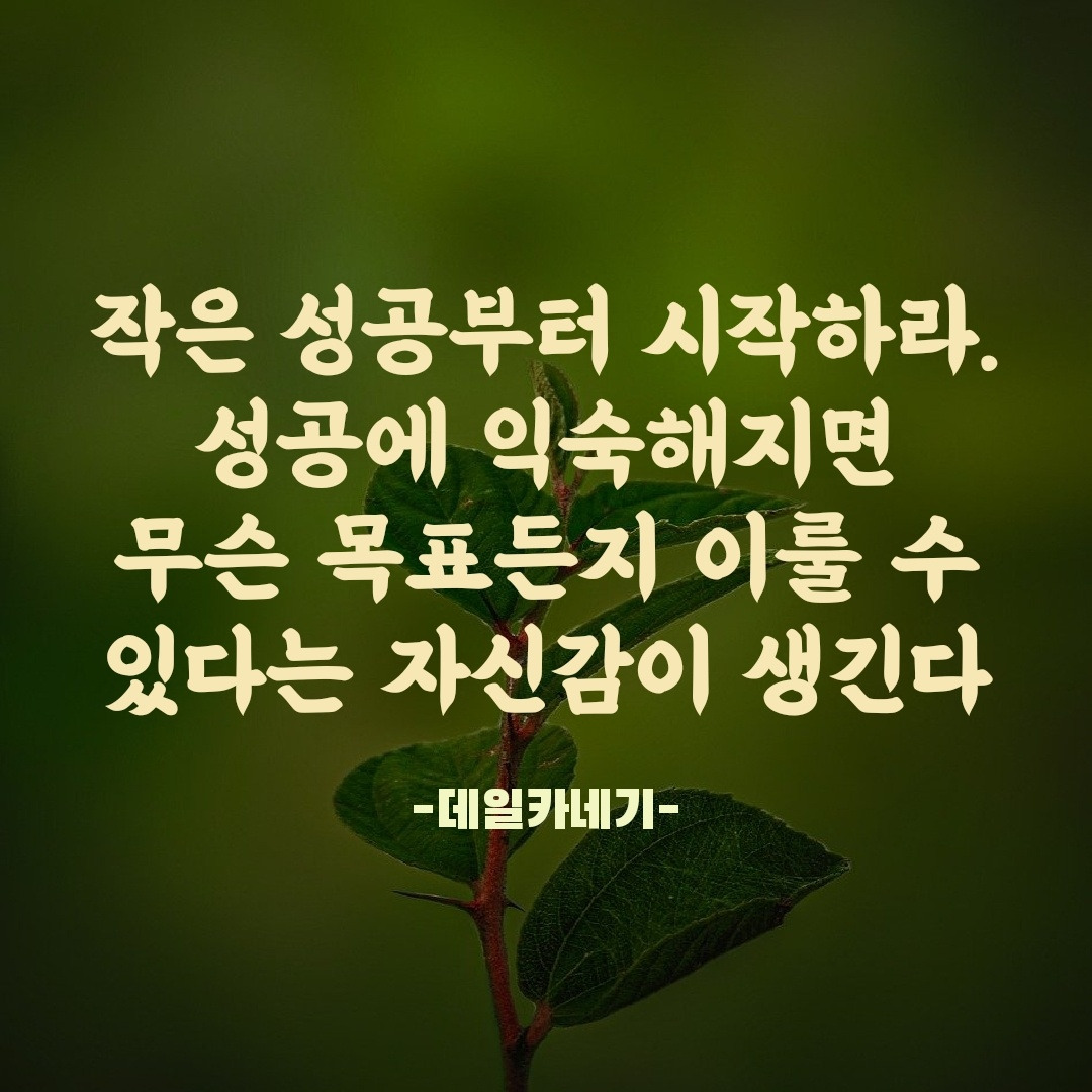 데일카네기의 글귀를 보며 나의 작은 성공들을 생각했다. 학창 시절 고무동력기 대회에 나가서 처음으로 수상을 한 날, 생각해보지도 않았던 공부 목표를 세우고 달성하게 된 날들이 내겐 작은 성공의 씨앗이었다. 두 분의 선생님께서 내게 심어준 작은 성공의 기억과 가슴 벅찼던 행복감이 나를 도전하는 인간형으로 만들어주셨다. 그 감정들이 얼마나 강렬했는지 작은 성공의 씨앗들이 자라고 자라 훗날 아줌마가 된 지금까지도 난 마음먹으면 무엇이든 해낼 수 있다는 자신감을 가지고 있다. 그리고 꾸준하게 작은 성공들을 이어가고 있다.