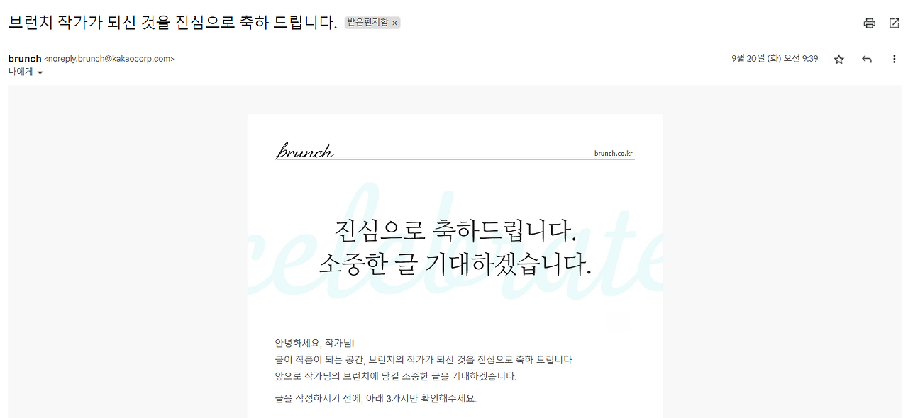처음 브런치를 시작했을 때는 가입만 하면 글을 발행할 수 있는 줄 알았다. 그러나 브런치는 다른 플랫폼과는 다르게 사람들에게 공개되는 글을 발행하기 위해서는 작가 승인이라는 것을 받아야 했다. 사실 나의 경우에는 글을 쓰는 목적이 혼자 보기 위함이라기보다는 사람들에게 읽히는 글을 쓰는 것이었기 때문에 반드시 통과해야 하는 관문이었다.