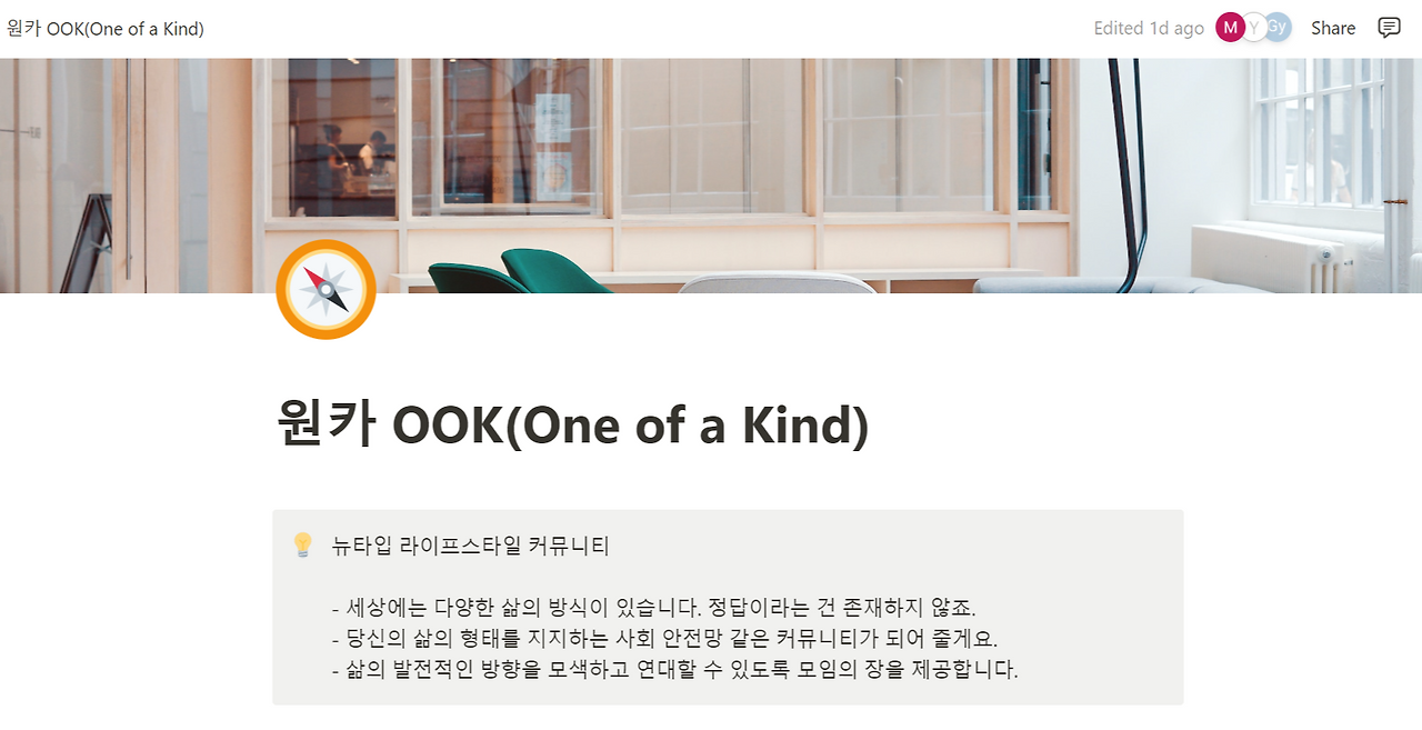 그러다 우연히 나와 비슷한 생각을 가진 사람들을 만나게 되었고, 기존의 틀에서 벗어나 다양한 삶의 모습으로 충분히 멋지게 살아가는 사람들이 많다는 사실을 알게 되었다. 그리고 그들과의 대화를 통해 서로의 고민을 나누며 어쩌면 이 세상에 정답이라는 건 존재하지 않을지도 모른다는 생각에 이르렀다. 현재 사회의 기준은 과거로부터 고착되어온 낡은 산물일 뿐이며, 세상은 빠르게 변하고 있고 정답은 항상 변하기 마련이라는 사실 말이다. 그래서 나와 같은 가치관을 가진 사람들과 함께 사회적 안전망이 되어줄 커뮤니티를 만들기로 결심했다.
