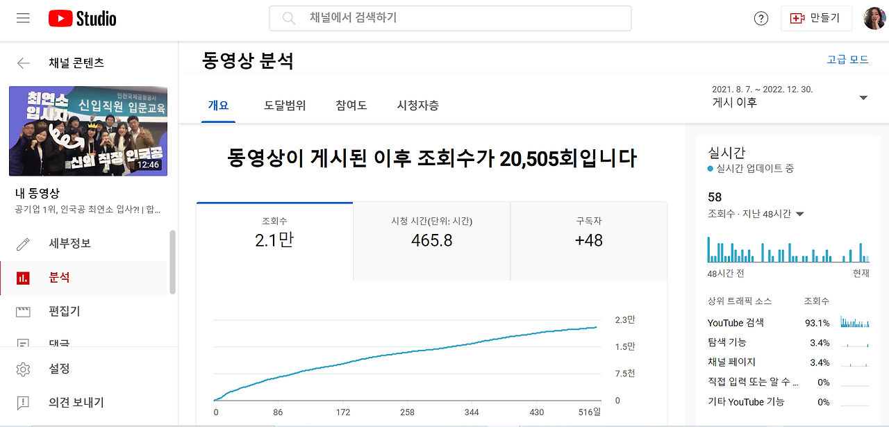 유튜브는 구독자와 영상 조회수가 비례하지도 않고, 알고리즘을 타고 영상 한두 개가 터지면서 채널이 급성장하는 경우가 많으므로 꾸준한 업로드가 관건이다. 참고로 내 영상 중 가장 조회수가 높은 영상은 2만 뷰가 나온 인국공 최연소 입사 관련 영상이며 이 영상으로만 약 50명 정도의 구독자가 생겼다. 그리고 타 채널에서 촬영했던 인터뷰 영상을 통해 20명 정도가 늘었으니 나머지 영상들에서 각각 10명 정도의 구독자가 생긴 셈이다.