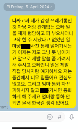 이 와중에 친정아버지는 내 속을 또 뒤집는데 출산 전에는 그냥 넘어갈 것을 나는 이번에 제대로 경고를 드렸다.