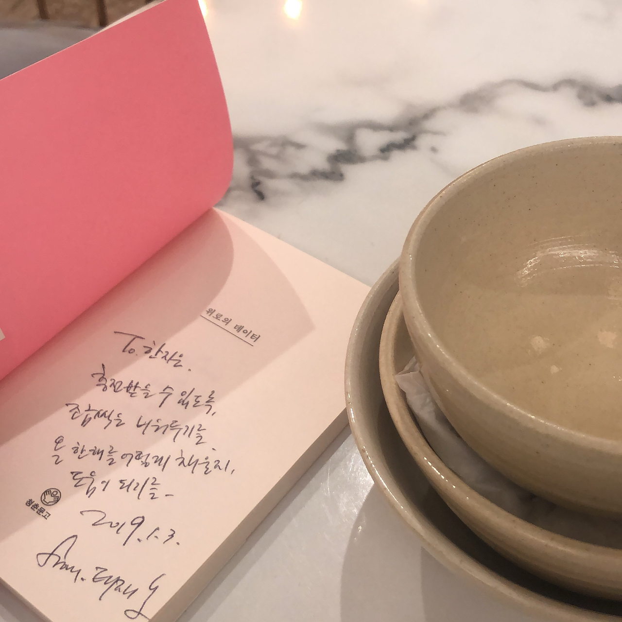 만나기로 한 친구가 도착하기까지 시간이 남아 해방촌의 독립서점, 스토리지북앤필름에 들렀다. 7시면 문을 닫는 곳에 6시 40분이 되어 들어갔다. 서점을 지키고 계시던, 오래전부터 SNS로 보아온 작가님이 너무 당연하게 내 이름을 부르며 알아봐주셨다. 어떻게 한 눈에 나임을 알아봐주셨을까. '눈썰미가 좋은분이다.'라고 생각했다. 나를 위해 책방 문을 조금 더 열어주신 고마운 작가님의 시집을 사고 2019년 첫 서명을 받았다. 기분좋아.