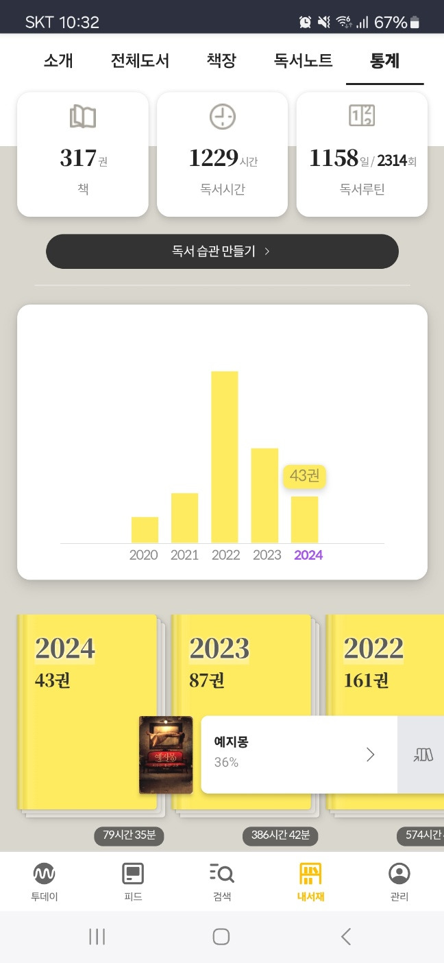 위에 있는 통계를 보면 알겠지만 2022년도에 비해 2023,2024년 해가 지날수록 독서량이 떨어지는 것을 확인할수 있다. 이것은 하고 있는 회사 일로 인해 시간을 많이 할애하지 못한 부분도 있다. 그렇지만 중요한 포인트는 내가 책을 읽는 행위보다 글을 쓰는 행위에 시간을 더 많이 부여했기 때문도 있다. 또한 독서라는 행위를 강박에 갇혀 하는게 아닌 즐거운 행위라는 점에 포커스를 맞췄기 때문이기도 하다.