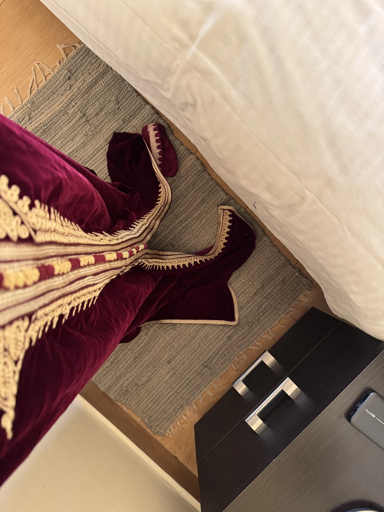 결혼 준비로 일찍이 모로코에 도착한 K는 스페인에서 모로코에 도착할 때 픽업 서비스를 타는 게 어떠냐고 제안했다. 일반 택시비보다 비싼 금액이었지만, 카프탄을 편하게 받을 수 있는 값이라 생각하기로 했다. 차량 뒷좌석에는 투명 비닐로 포장된 카프탄이 곱게 접혀 있었다. 와인색과 금색의 조합이 꼭 고려대학교 응원복 같았다. 픽업 서비스를 쓰기로 한 건 신의 한 수여서, 기사님 덕분에 숙소 호스트와도 원활히 만날 수 있었다. 모로코 사람들은 프랑스어나 아랍어를 쓰는데 둘 다 할 줄 몰라서 어버버거리는 나를 기사님이 구해주신 것이다.