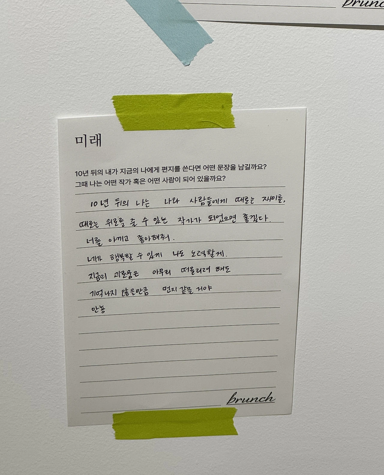 이런. 벌써 새벽 세 시 반이야. 너에게 편지를 쓰느라 작사 학원 과제도 포기했어. 그만큼 이게 나한테 중요한 일인 거겠지. 사실 과제를 못 한 게 완전히 네 탓은 아닌 게 몇 시간 전까지 풋살 친선전 중이었어. 나는 비록 골은커녕 패스 실수도 엄청났지만, 우리 팀이 7:2로 이겨서 기뻐. 제발 5년 뒤에도 우리 팀이 매주 만나서 풋살하고 있다고 얘기해 줘. ‘골때녀’ 출연까지는 바라지 않을게. 다치지 않고 다들 함께한다고 말해줘. 그리고 운명적인 냥줍도 해서, 지금 폭 안긴 고양이를 쓰다듬으면서 자고 있다고 말해줘. 앗, 어쩐지 바라는 게 많아졌네.
