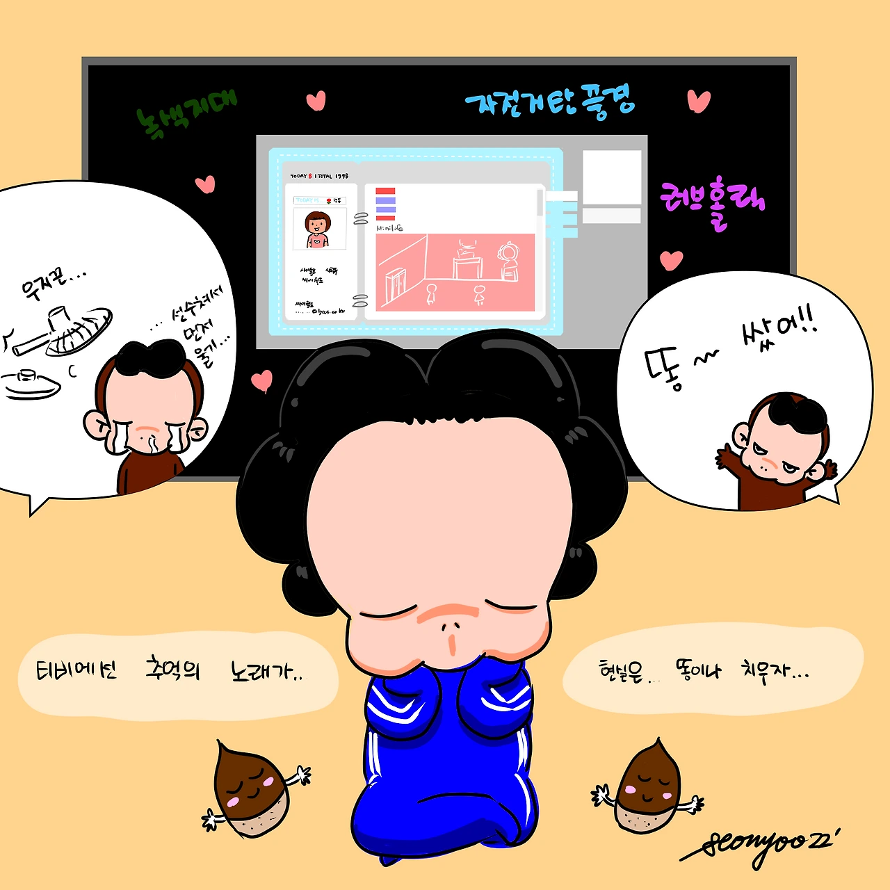 티비에서 추억의 노래가 나온다. 왠지 마음이 센치해진다. 중간 중간 빵득이의 외침에 현실로 돌아오지만 참 좋다. 그립다. 1998! 나의 20대.