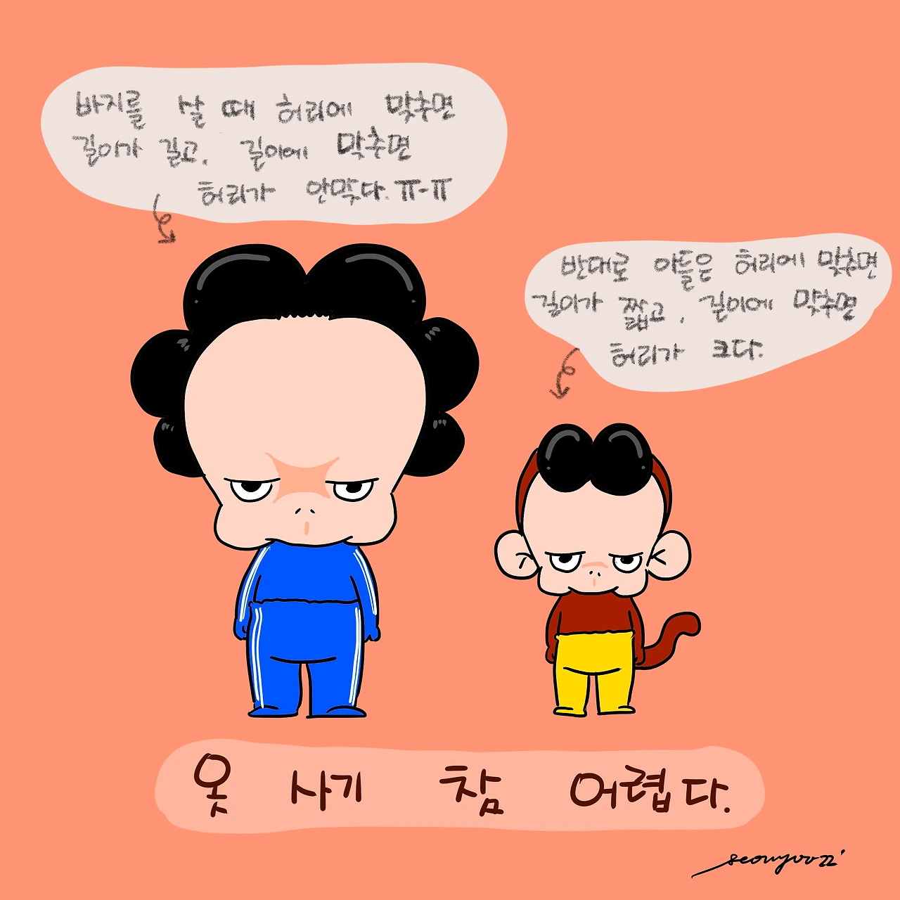 아침에 등원 준비를 하는데 꺼내 둔 바지가 짧다. 그래서 벗기고 다른 바지를 다시 입히는데 또 짧다. 그래서 새로 산 바지를 입히니 이번엔 허리가 크다. 밉상 빵득아범이 요며칠 빨래에 소홀해서인지 바지 찾기가 더 힘들다. 베란다 건조대에서 찾은 상하복을 입혀서 겨우 등원시켰다. 엄마는 허리에 맞추면 길이가 길고 길이에 맞추면 허리가 작아서 슬픈데 꼬맹이는 딱 반대다. 같은 지붕아래 옷 사기 힘든 이유가 이렇게 다르다.