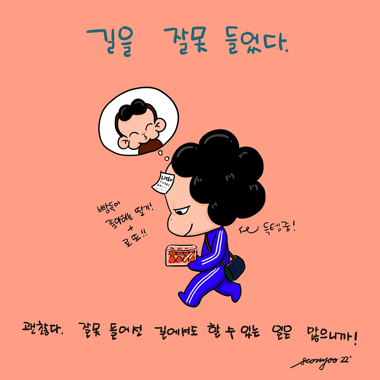 2주에 한 번! 시민기자로 본분을 다하기 위해 자료 조사에 나섰다. 그러다 좌회전 해야할 곳을 놓쳐 한참을 그대로 직진했다. 그러다 눈에 들어온 로또 명당점! 차를 세우고 한 장 구입! 평소엔 돈 아깝단 생각에 잘 안사는데 오늘은 이쯤되면 운명아닌가? 그래서 샀다. 조금 더 지나니 이번엔 하나로 마트가 눈에 들어온다. 빵득이 생각에 딸기를 사러 들어갔다. 가격이 괜찮다. 흐뭇한 기분으로 다시 차에 타고 보니 바로 앞에 유턴 표시가 보인다. 단조로울뻔 했던 일정이 좌회전 한 번 놓친걸로 좀 더 풍성해졌다. 그리고 어떻게 됐냐면… 목적지까지 도착해서도 자료 위치를 못찾아서 한참을 걸어야했다. 그래도 목표는 달성했으니 됐다. 길을잘못 드는 것도 때론 괜찮은 것 같다. 인생길도 그렇듯!