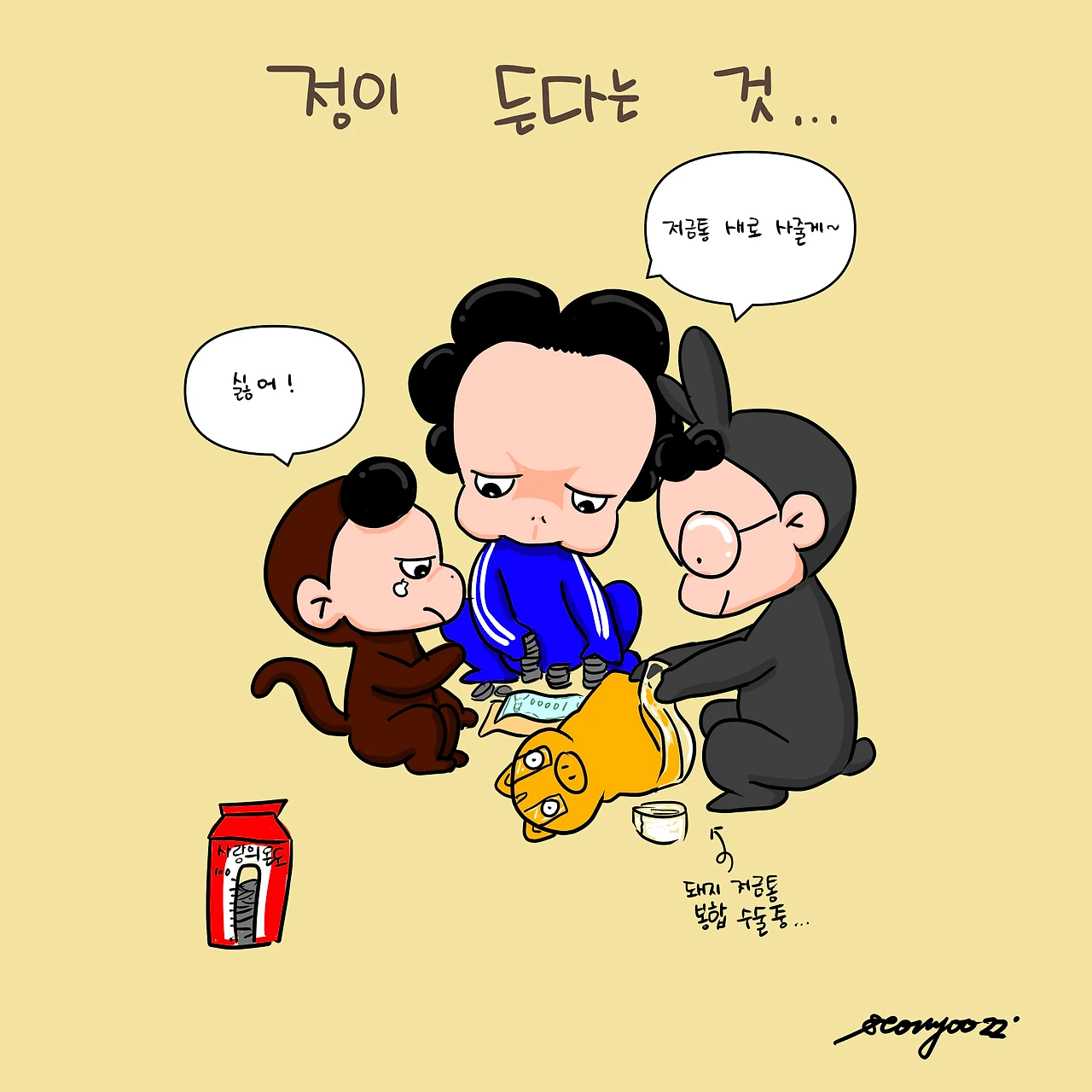 해마다 이맘때면 어린이집에서 빨간저금통이 도착한다. 불우이웃을 돕는 용도다. 그리고 이 날은 빵득이 돼지 저금통 속 돈이 밖으로 나오는 날이기도 하다. 빨리 가져가고 싶은 마음에 신나서 빨간저금통 상자를 접은 빵득이. 여느해처럼 돼지저금통을 가져오했더니 혹시 찢을거냐고 묻는다. 돈을 꺼내려면 달리 방법이 없으니 그렇다고 했다. 갑자기 표정이 좋지않다. 찢는건 안된다고 하길래 새 저금통을 사주겠다했다. 그래도 안된단다. 그래서 빵득 아범이 아랫쪽만 살짝 뜯어서 돈을 빼고 테잎으로 다시 막아주겠다고 했다. 그제서야 허락이 떨어졌고 조심조심 개봉에 들어갔다. 그런데 생각보다 쉽지않다. 십자형태로 작게 자른뒤 돈을 꺼내려니 잘안된다. 그래서 더 많이 자르라니 빵득이 눈에 눈물이 글썽글썽한다. 조금만 자르라고 막아선다. 결국 조금만 더 잘라내는 선에서 마무리 지었다. 그리고 테잎으로 봉합수술도 마쳤다. 그렇게 슬픈 눈을 하더니 언제 그랬냐는듯 동전으로 채워진 빨간저금통을 바로 가방에 넣는다. 나중에서야 보니 눈에도 투명테잎이 발라져있다. 빵득이에게 이유를 물으니 눈 스티커가 떨어지길래 붙여둔거란다. 일년새 정이 들긴 많이 들었나 보다.