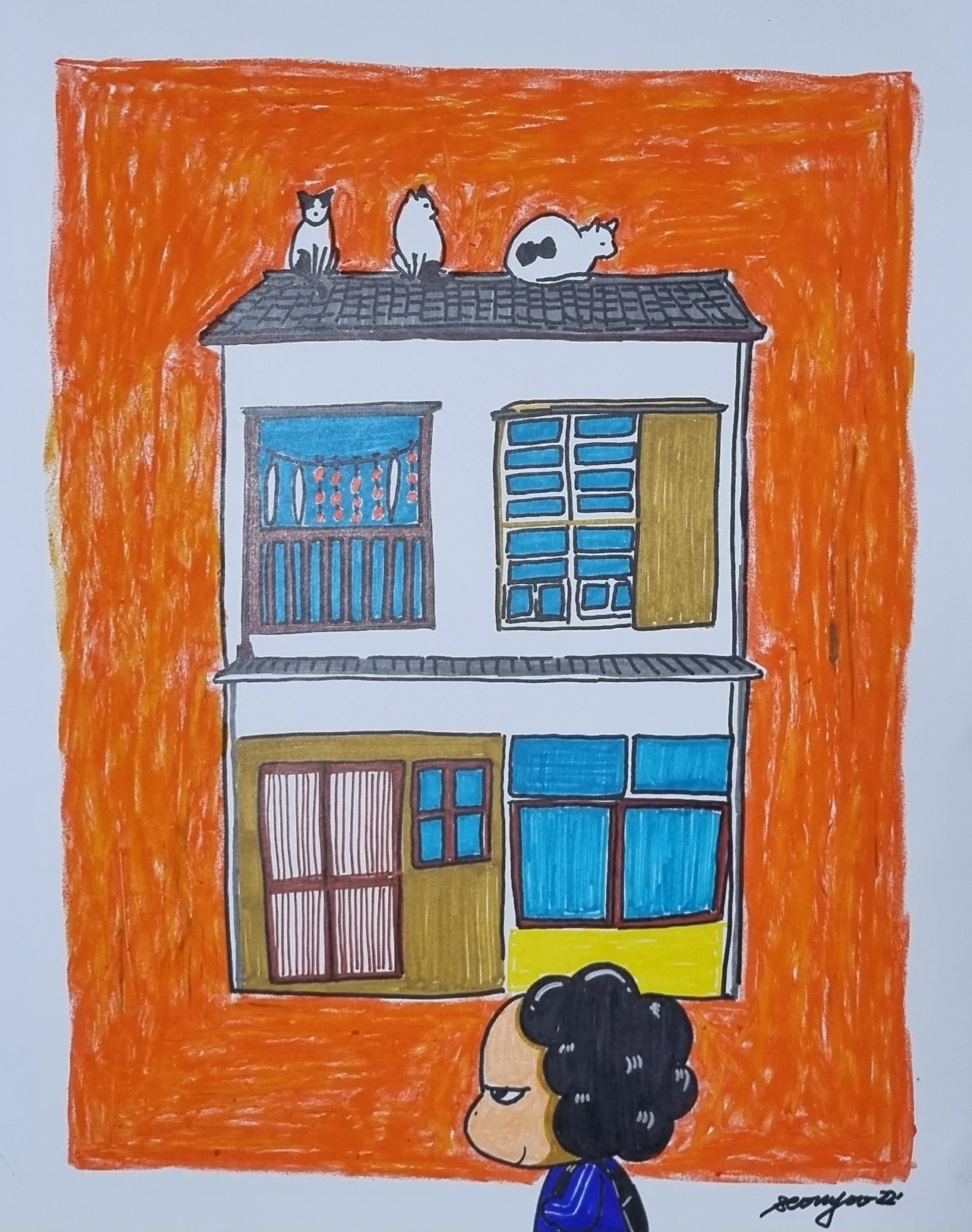 전시장에 작품을 걸고 다른 작가들의 워크숍을 보러 가는 길 재밌는 풍경이 눈에 들어왔다. 곶감은 한국에서도 말리지만 길다란 무가 매달려 있는게 특이하면서 재밌었다. 유명한 문화재들도 멋지지만 이런 사소한 풍경이 참 좋다. 그리고 이곳엔 유난히 고양이들이 많이 보인다. 오늘 네마리를 만났는데 기억에 남는 세마리를 함께 그려넣었다. 또 하루가 지나간다.