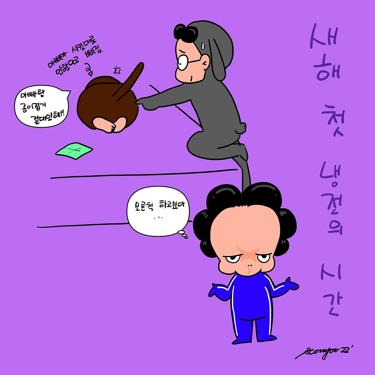 저녁 식사 후 비염끼가 심해져 안방에 드러누웠다. 그 사이 두 부자는 식탁에서 종이접기를 하고 있었다. 잠시 후 빵득이가 잔뜩 화가 나서 씩씩대며 안방으로 들어왔다. 그리고는 평소처럼 엉덩이만 보인채로 엎드려선 다신 아빠랑 종이접기를 하지 않겠다고 한다. 자기가 설명하는대로 따라하지 않아서 화가 났다고 한다. 빵득 아범이 뒤따라 들어와 달랬지만 소용이 없었다. 아빠가 나가자 눈물 콧물 범벅으로 엄마한테 안겼다. 눈물을 그치는가 싶더니 달력을 가져와 적힌 글씨들을 지우기 시작했다. 아빠와 종이접기 월간계획표 같은 건데 곧 후회할거래도 절대 안할거라며 꿋꿋히 지웠다. 그 짧은 시간 잠시 거실로 간 줄 알았던 빵득아범은 소파에서 코를 골고 있다. 3~40분쯤 흘렀을까. 둘은 화해를 했고 빵득이는 달력을 보며 후회했다. 그리고 다시 적었다. 엄마 말 들으라니까 … 누굴 닮아서 별난 건지 모르겠다. 생각난 김에 절대란 표현은 함부로 쓰는거 아니라고 알려주었다.