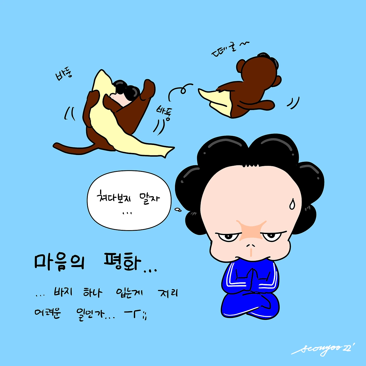지난 금요일. 태권도를 마치고 표정이 어두운 빵득이. 굳이 집에 도착하면 이유를 일러준대서 기다렸다. 이유인즉 남자, 여자친구들이 교대로 에어바운스를 타는데 교대시간이 다 되어 선생님이 내려오라 하셨는데 남자친구 몇몇이 내려오는 쪽을 막고 놀고 있어서 내려오지 못하다 마지막에 내려왔다고 한다. 가끔 단체로 혼날 때가 있는데 그날도 그럴까봐 꽤나 긴장한 모양이다. 그래서 여럿이 뭔가를 배우거나 학교에서 수업을 듣거나하면 불가피하게 단체로 혼날 일이 많을거라고 어쩔수 없다고 현실적인 이야기를 해줬다. 어릴 때부터 누군가와 부딪히는 것, 다투는 것에 두려움이 많아 피하는게 눈에 보였다. 덕분에 싸워서 다치거나 하는 일은 없었다만. 그리고 오늘 아침 어린이집으로 데려다주며 다시 한번 이야기를 나눴다..기 보다 일방적으로 일러뒀다. ‘넌 이미 엄마아빠에게 충분히 사랑받고 있어. 할머니 할아버지도 마찬가지고. 그러니 괜히 혼날까 겁먹고 눈치 안봐도 돼. 모든 사람들에게 사랑받지 않아도 가족들에게 충분히 받고 있으니까. 혹시 또 단체로 혼나더라도 너무 신경쓰지마. 그건 어쩔수 없는거니까.’ 라고. 그래서 당분간 혼내지 말자 결심 했는데 목욕 후 옷을 입는 걸 보고 있자니 속에서 화르르 장작타는 소리가 들린다. 바지 하나 입는데 이쪽에서 저쪽으로 한참을 굴러다니고 있다. 애써 고개를 돌렸더니 좀 낫다. 만 6세는 오늘도 쉽지 않다.