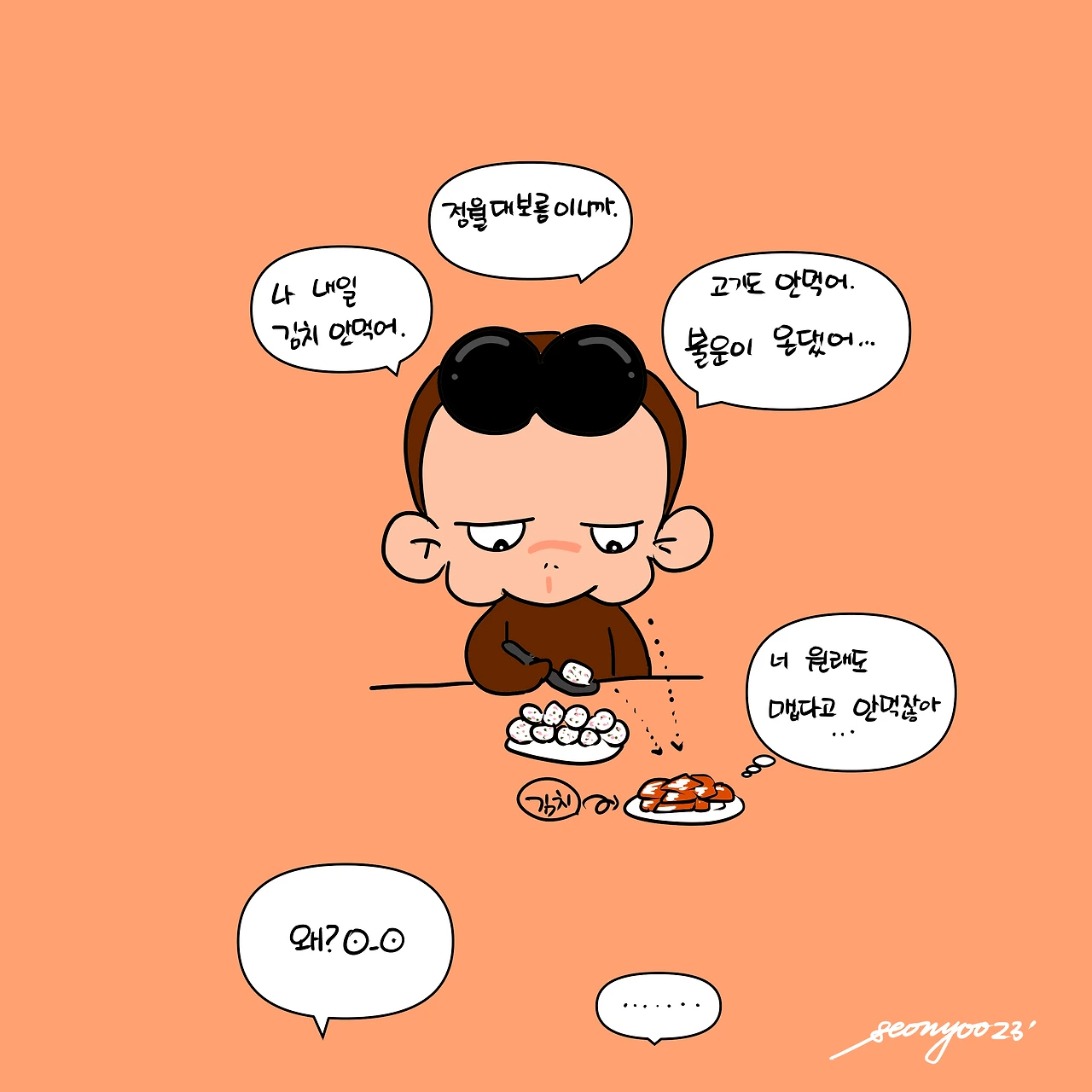 앞 니가 흔들리더니 잇몸이 아프다는 만6세. 숟가락 사용이 여의치 않은듯 해서 저녁은 주먹밥으로 준비했다. 선물로 받은 스팸을 굽고 어제 빵득이가 받아온 나물도 다져 넣었다. 밥을 먹던 빵득이가 김치를 빤히 쳐다보더니 갑자기 내일은 김치를 먹지 않겠다고 한다. 그래서 왜냐고 물으니 내일이 정월대보름이라고 대답했다. 덤으로 고기도 먹지 않겠단다. 불운이 온대나… 듣도 보도 못한 소리지만 그러라고 했다. 그런데 생각해보니 이 아이 평소에도 빨간 김치는 맵다고 안먹는다.