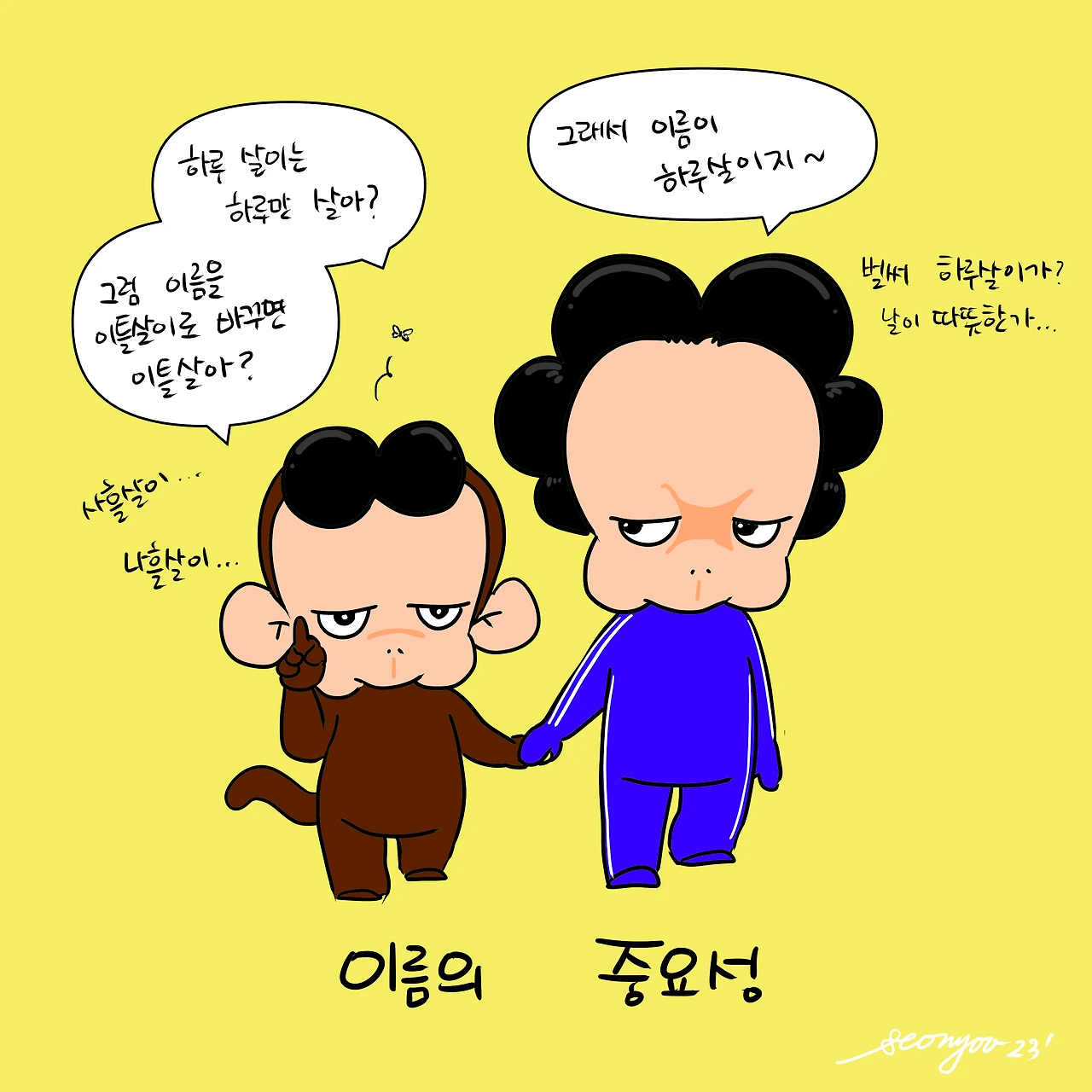 날씨가 갑자기 따뜻해지니 하루살이인지 날파리인지가 공기 중에 등장했다. “하루살이는 하루만 살아?” “그래서 이름이 하루살이지~” 조금 심각해진 빵득이. “그럼 이름을 이틀살이로 바꾸면 이틀 사는거야?” “사흘살이, 나흘살이…” 작명학의 중요성을 새삼 깨닫는다.