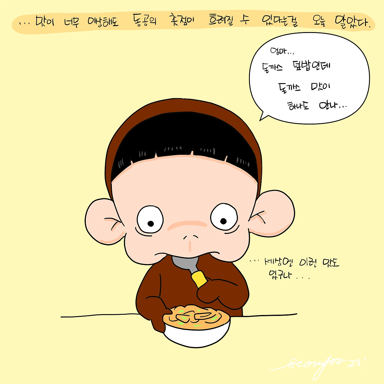 주말이면 어김없이 일찍 일어나는 초딩어린이. 엄마는 30분만 더 자고 일어날거라 했는데 눈떠보니 10시 30분이다. 급하게 시리얼과 삶은 계란을 챙겨줬다. 엄마를 깨우지 않고 얌전히 책을 읽고 문제집을 풀고 있던 빵득이에게 미안한 마음이 들었다. 그래서 점심은 제대로 챙겨주리라 마음 먹었다. 어제 남겨둔 돈까스 생각이 났다. 레시피 검색에 들어갔다. 돈까스 덮밥 만들기! 중간 과정에서 살짝 생략한 부분이 있었지만 일단 완성했다. 혼자 놀기 진수를 보여주며 놀고 있던 빵득이를 불렀다. 돈까스 덮밥이라고 설명했다. 한 입 먹은 빵득이가 갸우뚱 한다. 돈까스 맛이 안난다고 했다. 그래서 김가루를 좀 더 섞으면 괜찮을거라 했다. 두 숟갈, 세 숟갈 즈음 빵득이 표정이 멍~해졌다. 마치 체념하듯. 그러더니 옆으로 와서 내 볼에 뽀뽀를 해줬다. ‘그만 먹고 싶어?^^’ ‘어.’ 그렇게 점심 식사가 끝났다.