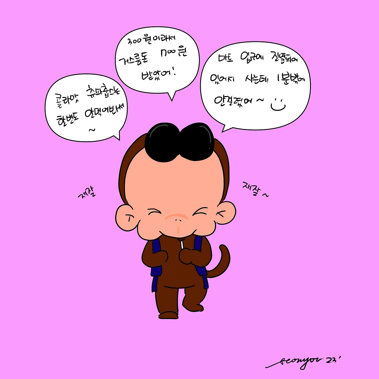 12월부터 정기적인 용돈을 받게 된 빵득어린이. 일요일 저녁마다 일주일치 용돈 2000원을 받는다. 몇차례 웃지못할 에피소드를 겪은 끝에 학교 앞 문방구와 마트에 혼자 드나들 수 있게 되었다. 어제도 평소처럼 친구들과 신나게 놀고 입에 사탕 하나를 물고 돌아왔다. (추측컨데 근방 또래 중 가장 많이 노는 어린이 중 한 명일 것이다.) 같은 피아노 학원 누나한테 정보를 입수한 바에 의하면 콜라맛 츄파춥스는 학교 앞 마트에만 판다고 한다. 엄청난 일을 해낸듯 의기양양한 목소리로 사탕 구입 과정에 대해 설명을 해댔다. 300원으로 이렇게 행복할 수 있다니… 그렇게 행복해 하던 어린이는 수영장에 가자니 세상을 다 잃은 표정이 되었다. 수.영.장 세글자에 몸도 마음도 급 피곤해진 빵득씨다.
