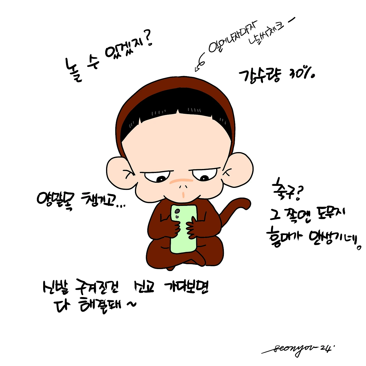 친구와 오늘 놀기로 약속했다며 주말부터 날씨에 민감한 어린이. 일어나자마자 스마트폰으로 날씨부터 체크한다. 강수량 30프로면 비가 온다는 거야 안 온다는 거야 하며 전전긍긍. 관심 분야 이 외엔 모두 허술한 어린이는 오늘 복장도 한숨 나오 게 만든다. 옷은 삐뚤삐뚤 신발 뒤축은 접혀 있고 앞쪽 로고부분은 저 아래로 들어가 있다. 불편하지 않아?라고 물으니 불편해도 신고 있다 보면 해결된다고. 무사히 출근 시키고 나니 바닥에 깔린 털실과 양말목 흔적들. 취향 존중을 외친 덕에 뜨개질까지 배우고 있는 효자는 오늘도 어렵다.