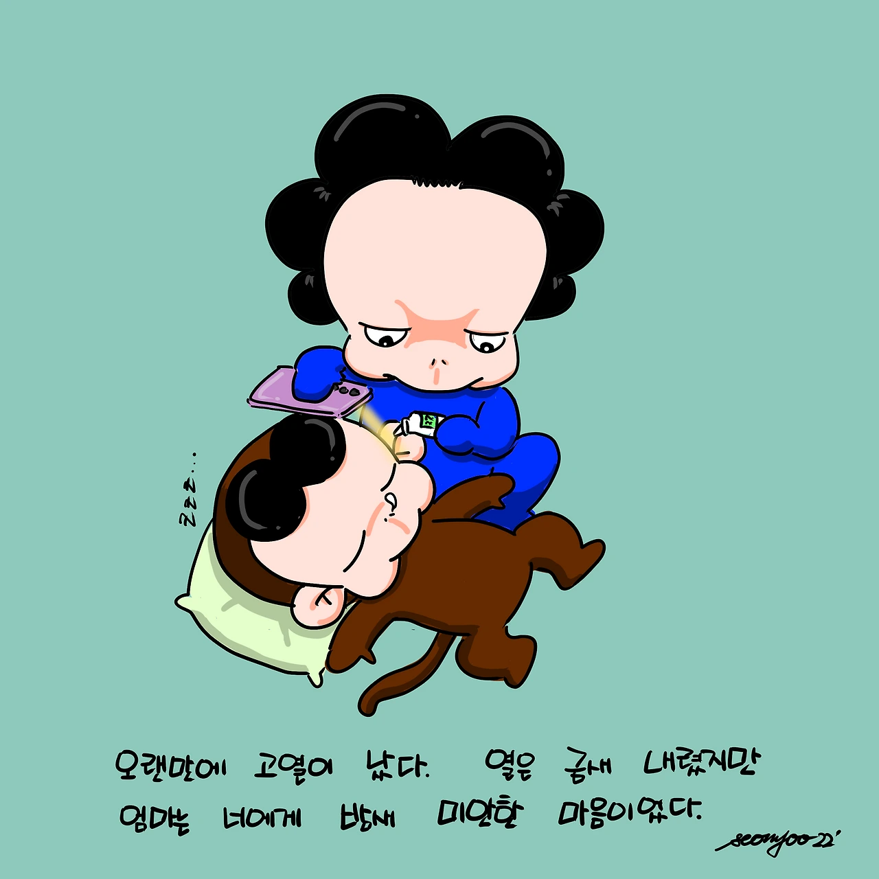 지난밤 갑작스레 고열이 난 일곱살. 초저녁부터 계속 안겨있으려 하고 저녁을 먹고나서도 엄마 품을 파고들길래 그냥 피곤한가 생각했다. 그러다 갑자기 춥다소리에 열을 재니 38가 훌쩍 넘어섰다. 한쪽은 39도. 얼른 코 부터 찔렀다. 다른 증상도 없었고 다행히 선명한 한줄이다. 최근 몇년 제대로 열이 난 적이 없어 해열제 유통기한이 거의다 지난것 뿐이다. 겨우 찾아낸걸로 일단 먹이고 집 앞 편의점으로 달려갔다. 단순 접종열이었는지 열은 금새 내렸다. 하지만 혹시나 또 열이 오를까 새벽 늦게까지 지켜봤다. 36.7, 36.9라는 숫자를 확인하고서야 잠들었다. 그리고 그 사이 왜 콧물기운이 있는데 접종을 하였을까, 집에 돌아오자마자 목욕을 시켰던게 이유일까.. 등등 미안한 마음의 연속이었다. 일곱번째 삼신상 덕분인지 고열은 더이상 없었지만 놀란 마음에 오늘 하루는 할머니집에서 쉬게했다. 어린이집에서 받아쓰기도 하고 피아노 학원 가는 날이라 빵득이는 어린이집에 간다고 졸랐지만 놀란 엄마 맘으론 절대 안될일이었다.