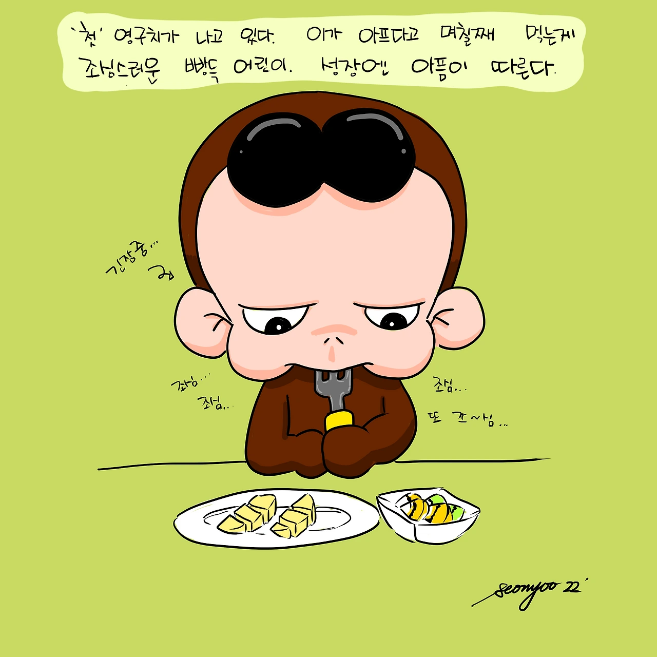 생일 즈음부터 첫 영구치가 나기 시작했다. 아랫니 하나 어금니 둘. 그러다 며칠 전부터는 이가 아프다고 딱딱한 음식은 거부중이다. 어린이집도 이틀이나 쉬셨다. 한 이틀 죽만 먹이다가 어제 카스테라랑 리조또는 괜찮지 않을까싶어 시켜주니 잘먹었다. 필라프까지는 괜찮다고 한다. 못먹으니 먹고 싶은게 많아진 일곱살. 뷔페도 가고싶고 치킨, 햄버거도 먹고 싶다한다. 그래서 오늘 저녁엔 혹시나하는 맘에 루피버거를 주니까 잘먹는다. 기준이 좀 애매하지만 어찌됐던 먹는다는 사실에 기쁜엄마. 그리고 내일 소풍엔 볶음밥과 키위같이 부드러운 과일을 준비하라고 했다. 일곱살의 성장통은 본인에게만 오는 건 아닌듯하다.