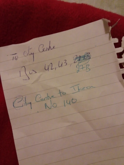지난밤 사건을 이야기하고는 이케아를 갈 거라고 말하니까 프리아가 시티에서 이케아로 가는 버스 번호를 말해주었다. 머릿속은 버스 번호를, 입 속은 차디찬 우유에 말은 시리얼을 부지런히 채우고 있었다. 밖에 나온 것 같은 느낌이 들 정도로 추운 화장실에서 후다닥 씻고 방으로 올라가려는데, 주방 식탁에 웬 쪽지가 올려져 있었다. 프리아가 시티까지 가는 버스랑 시티에서 이케아가는 버스를 적어서 올려놓은 것이었다.