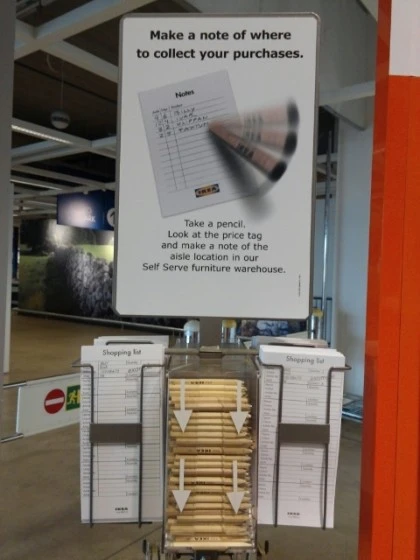 어젯밤부터 얼어붙었던 내 몸과 마음이 녹는 기분이었다. 프리아 덕분에 이케아는 수월하게 도착했고, 노란 쇼핑가방을 들고서 본격적으로 살 물건을 담을 차례였다. 매장 입구엔 쇼핑리스트를 적을 수 있는 메모지와 나무연필이 놓여 있었는데 사려는 제품과 고유 넘버, 복도 번호 등을 기록해 두면 나중에 셀프 코너(물건을 모두 모아놓은 큰 창고 같은 곳)에서 물건을 가져오기 편했다. 물건을 보고 바로 담을 수도 있지만, 재고가 없으면 셀프 코너에서 찾아 가져와야 해서 쇼핑리스트와 연필은 이곳의 필수템이었다.