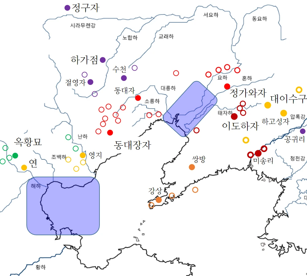 아래.지도에 문화/유형에 해당하는 물건들이 발견되는 장소를 표시하였습니다. 문화/유형의 중심이 되는 장소는 채워진 원으로, 같은 문화/유형의 다른 장소들은 같은 색의 빈 원으로 그렸습니다. 파란 사각형은 물가가 땅 안쪽으로 들어와 있었음을 단순하게 보인 것입니다.
