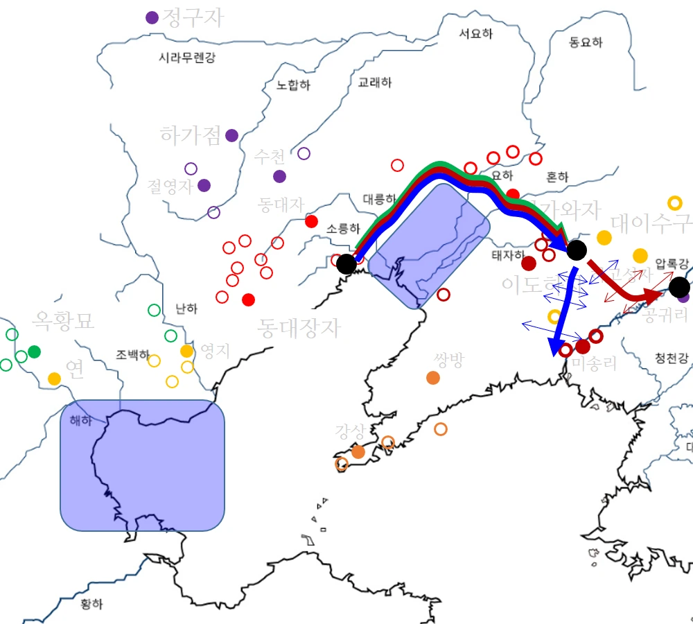 X-4 사기색은: ① 여순如淳이 ● 이르기를 "② 연이 ③ 일찍이 ④ 2(개) 국들을 차지하여 ● (2개 국들이) ⑤ 자신[己](=연)을 따르도록 하였다. ● (그리하여) ⑥ 응소應劭가 ● 이르기를 '⑦ □토(-군)[□莬](=현토-군)은 ⑧ 본래 ⑨ 직-번-국[直-番-國](=진-번-군)이었다.'고 하였다."라고 하였다. ①如淳云②燕③嘗④略二國●⑤以屬己也●⑥應劭●云⑦□莬⑧本⑨直番國
