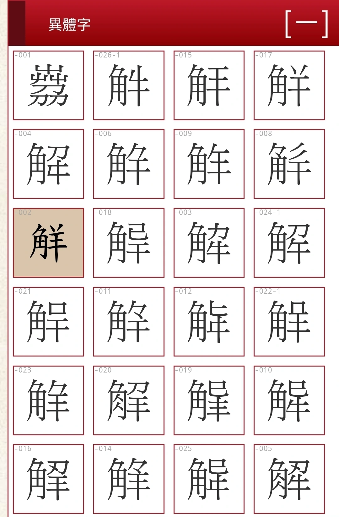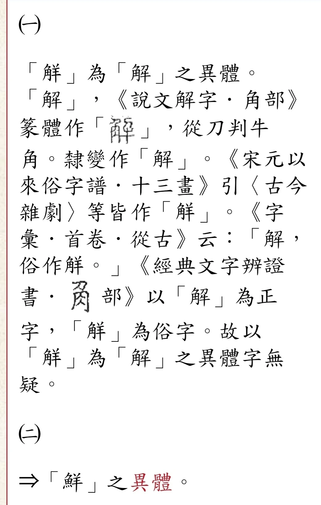 다시 돌아가, 대만 이체자 자전에서 이번에는 해解의 이체자를 찾아봅시다. 앞서와 같이 다양한 이체자들이 확인되는데, 그 가운데놀랍게도앞서 보았던 觧라는 글자가 포함되어 있습니다.