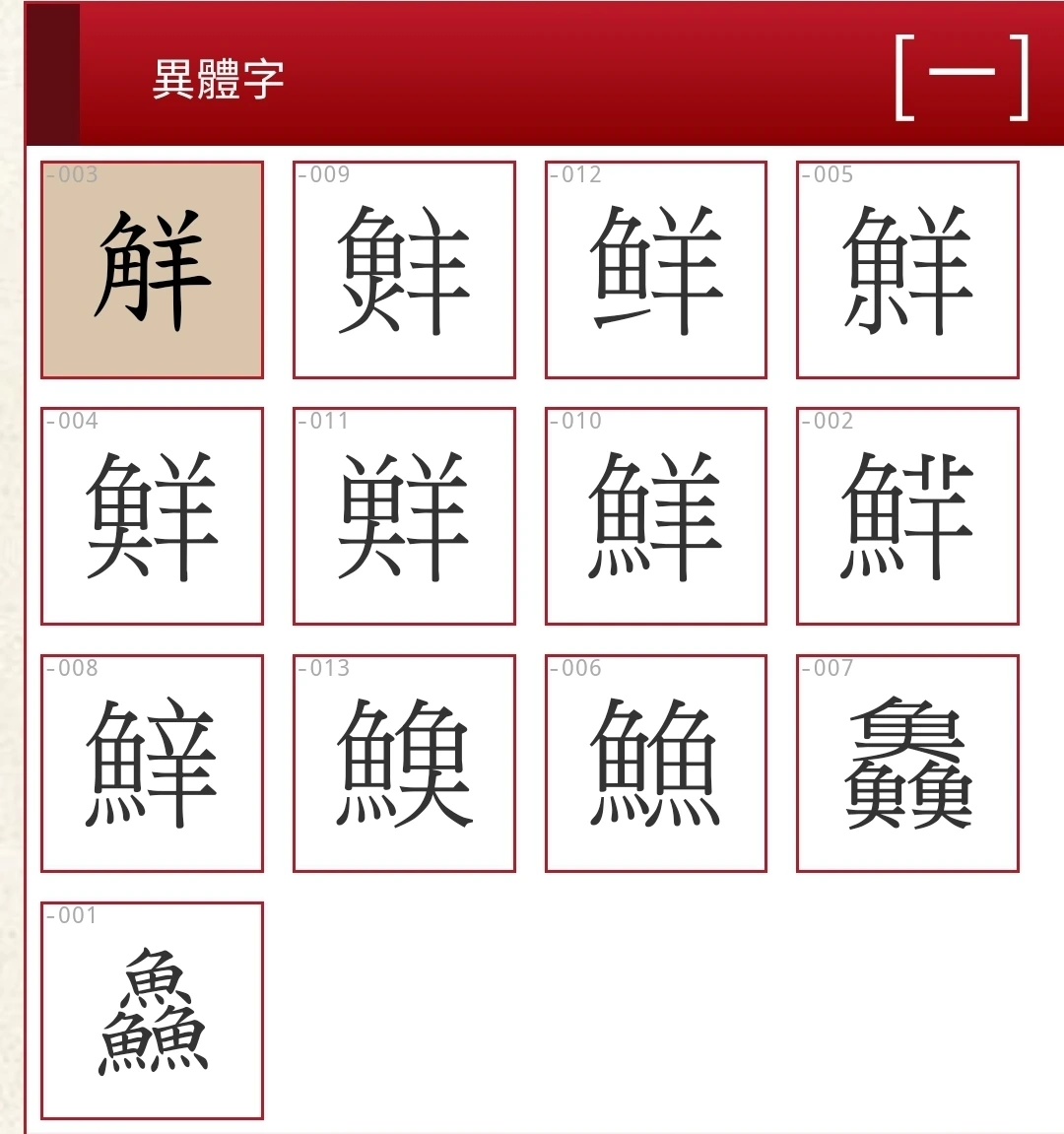 그런데, 어떤 글자는 소리가 같은 글자가 아니라 모양이 다른 글자 곧 이체자異體字를 써서 적기도 합니다. 그러한 다양한 이체자들을 대만 이체자 자전( https://dict.variants.moe.edu.tw/ )을 통해 찾아볼 수 있습니다.
