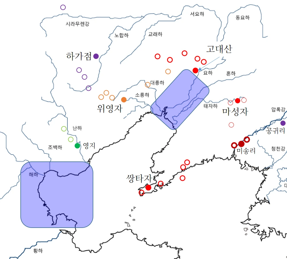먼저 B.C. 17-15C에 나타나는 것은 하가점 하층 문화인데, 고대-산 문화가 확인되는 장소들보다 서쪽 넓은 장소에 걸쳐 확인되며 또한 경계에서 함께 확인됩니다. 본래 산융과 발에 해당하는데 이 시기에 들어서는 점차 동쪽으로 옮겨가고 있었다고 생각합니다. B.C. 15C를 지나면 하가점 하층 문화는 확인되지 않습니다. 도하와 영지를 잇는 선 북쪽의 산줄기와 조선에 - 아마도 숙신에 의해 - 각각 산융과 발이 완전히 옮겨 머물게 되었기 때문이라고 생각합니다.