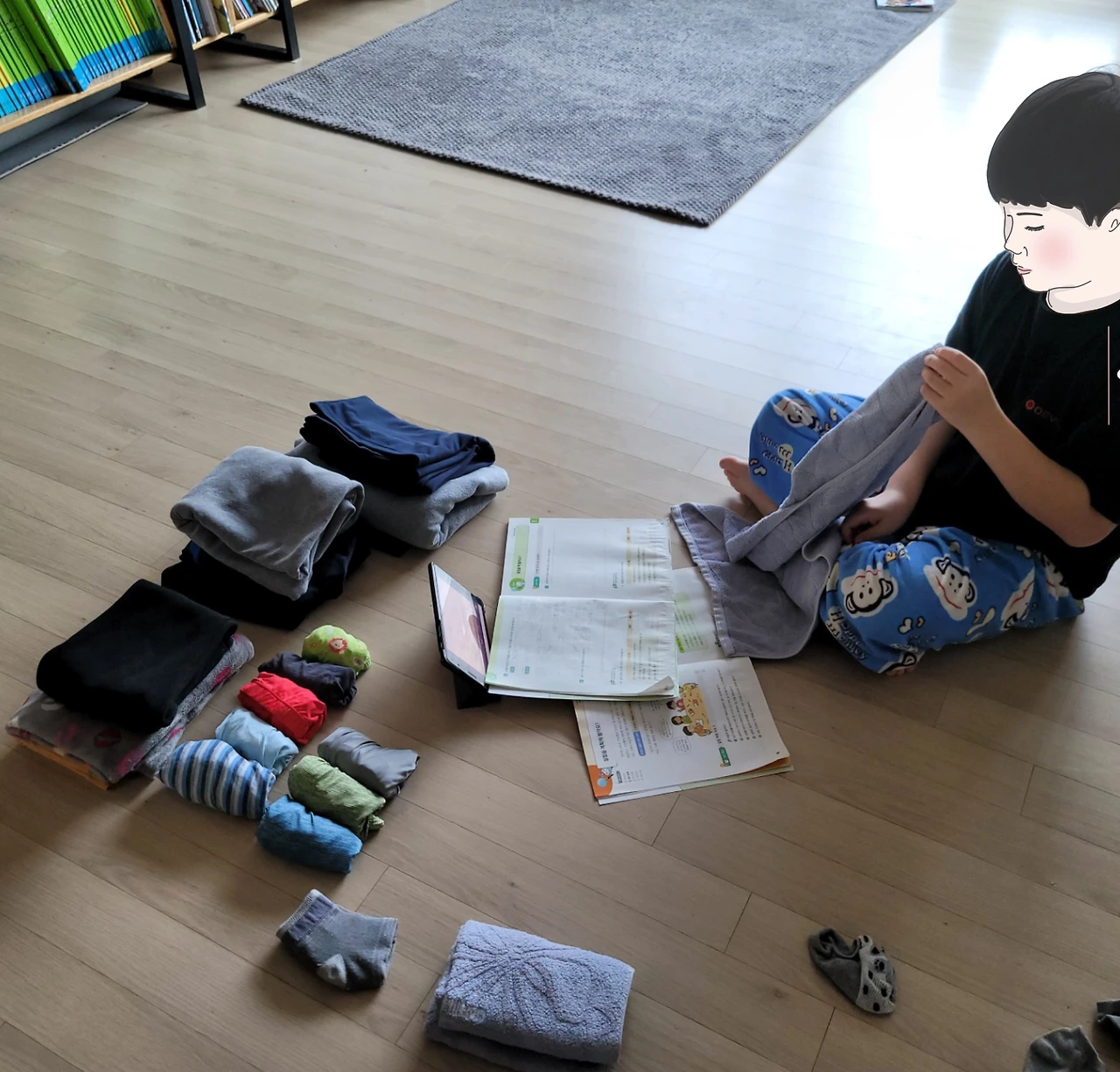 빨래 개면 10분, 음, 괜찮은 제안이었다. 건조기를 사면 마른빨래 정리가 쉬운 줄 알았는데, 이놈에 게으름 때문에 건조기에서 나와 옷장으로 들어가기까지가 참 쉽지 않다. 그걸 알고 제안을 한 건지 예준이는 눈을 반짝이며 말했다.