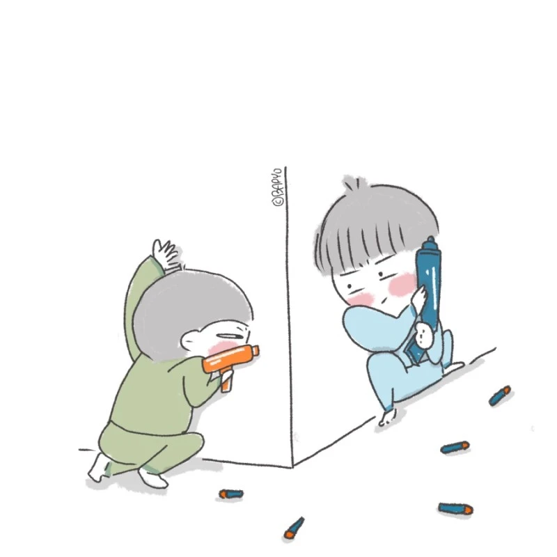한참 뒤 팽이 소리가 멈췄다. 대신 "두두두두 두두두두, 으~아~ 하하하하" 입술을 부딪혀 내는 총 소리 함께 숨이 넘어가는 듯한 웃음소리가 들리기 시작했다. 침대를 가운데로 밀어 경계를 만들어 놓고 둘은 전쟁을 벌이고 있었다. 각자의 손에 러프 건을 들고 바닥에 납작 엎드렸다 고개를 내밀었다를 반복했다. 좁은 방 안에서 백발백중의 사격 실력을 서로 뽐내며 배꼽 빠지게 웃어댔다.