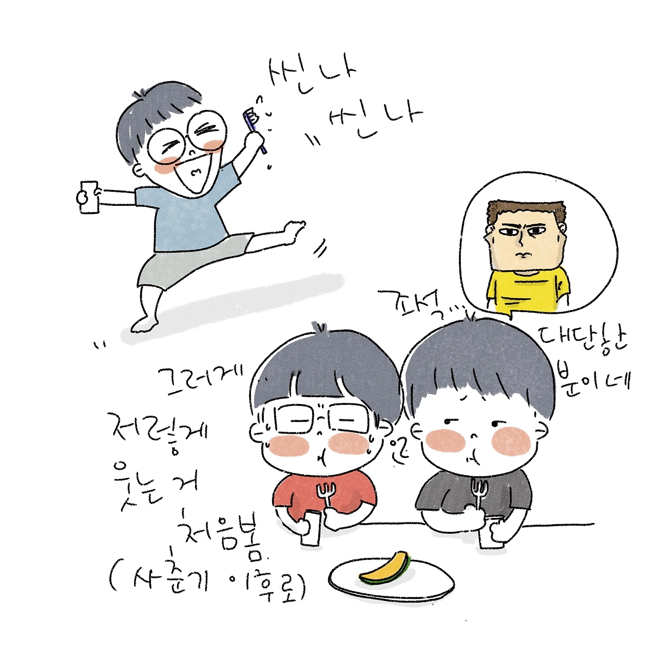 "그러게, 사춘기 아들이 잇몸 만개하고 거품 물고 저렇게 덩실덩실 춤을 출 줄이야."