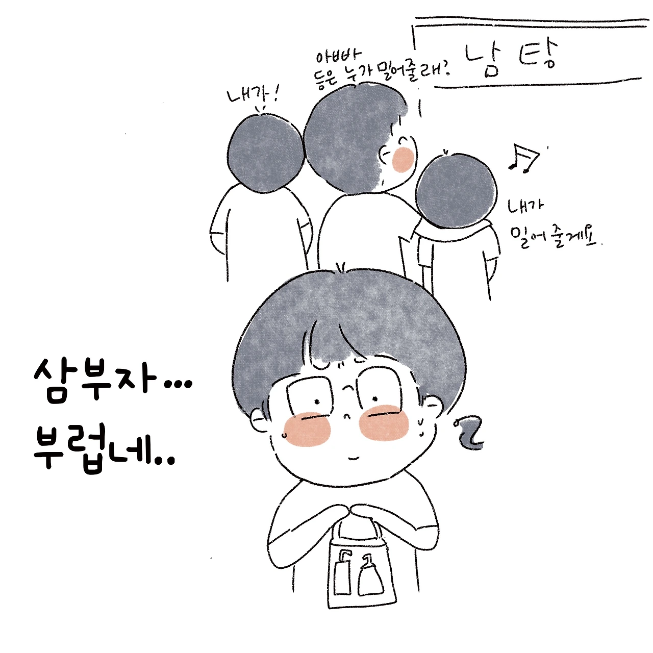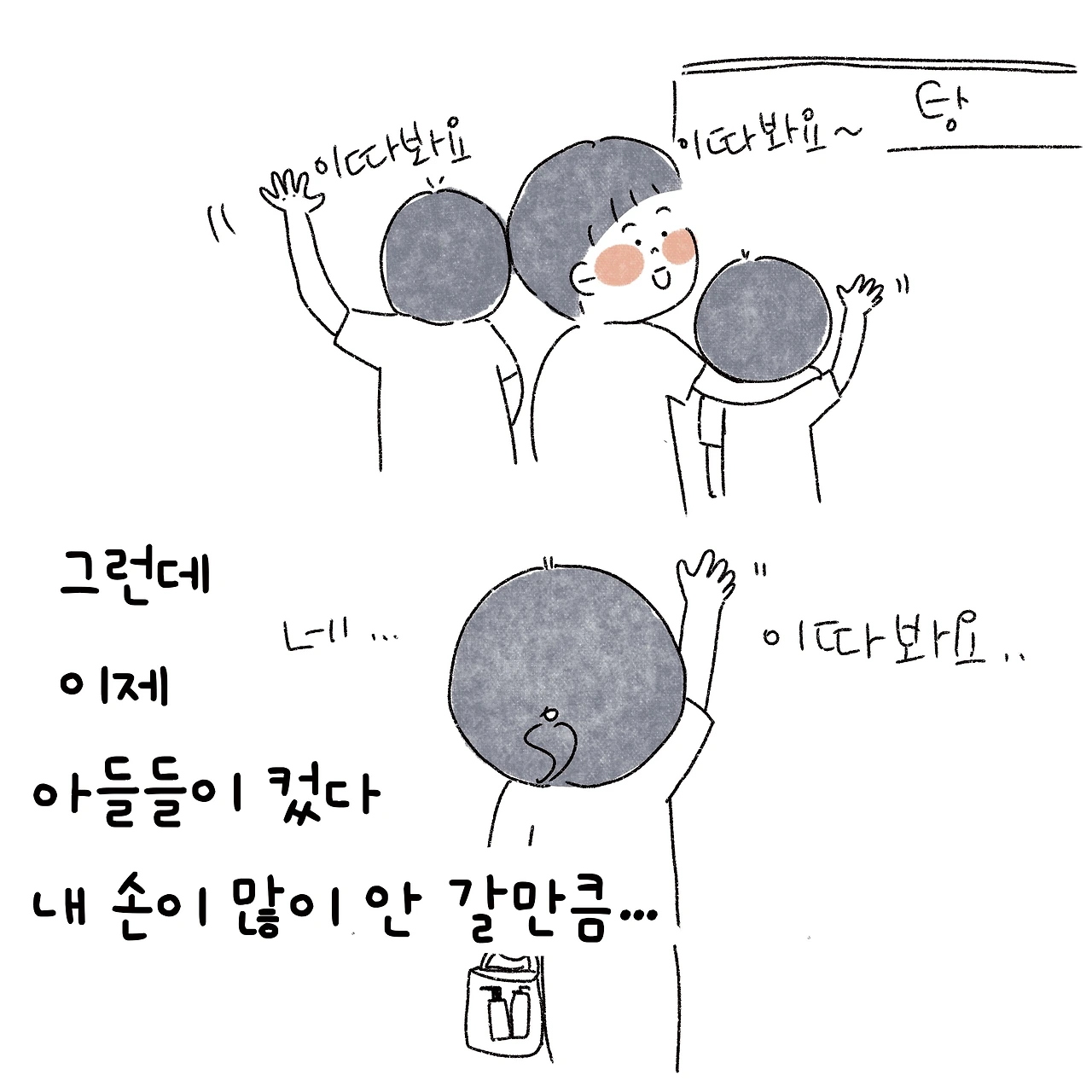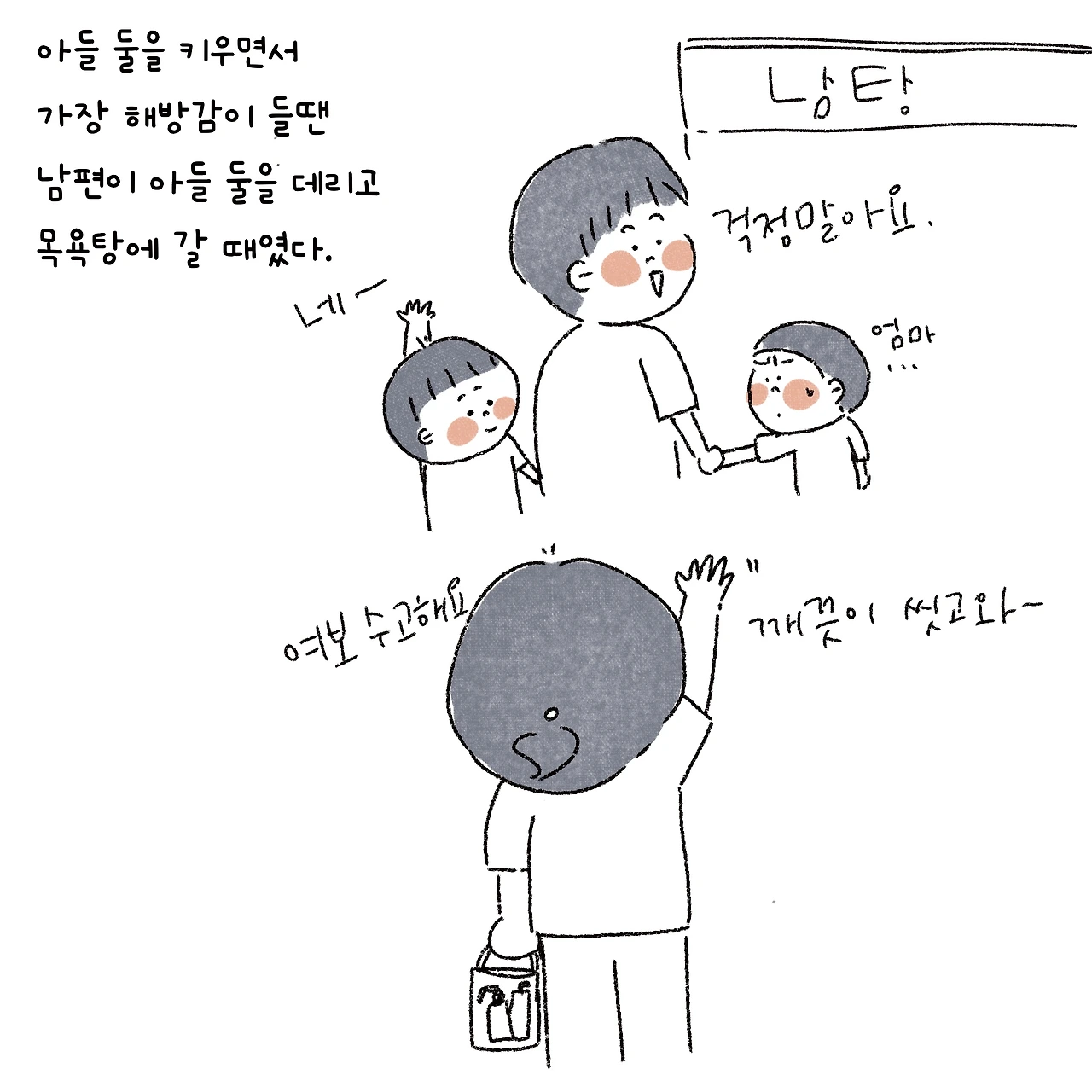 그 모습이 지금은 수고로워 보고였지만, 저 아이들도 우리 아들들처럼 크면 엄마의 등을 시원하게 밀어주겠지. 부러웠다.
