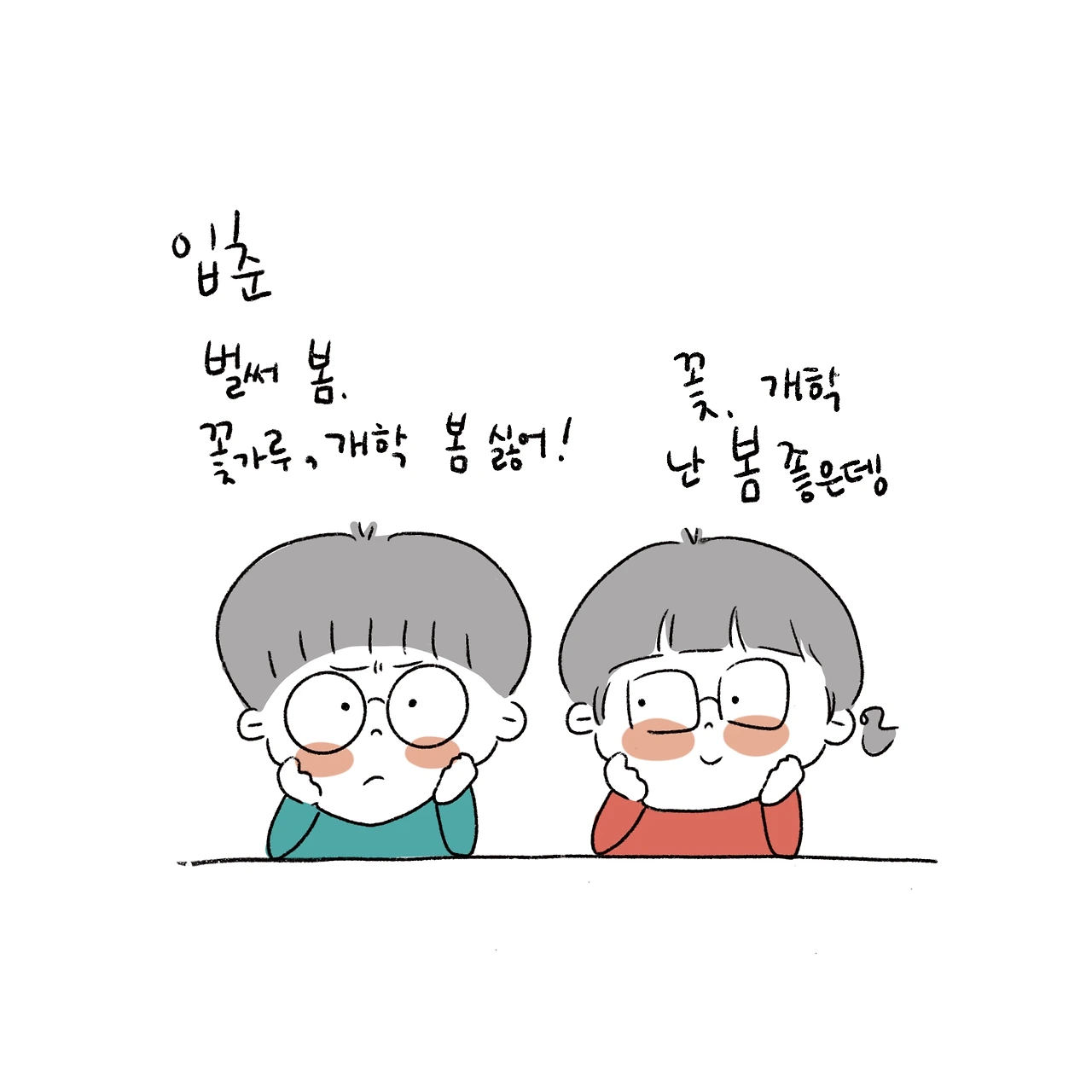 "응, 봄에 꽃가루 날리잖아. 난 비염 때문에 코도, 눈도 힘들어. 그리고 봄이 온다는 건 곧 학교에 가야 한다는 얘기잖아. 으아~ 싫어."