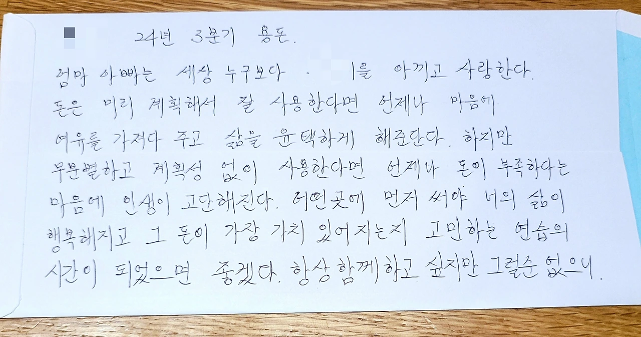 아빠는 방에 들어가서 한참 동안 용돈 봉투를 준비했다.