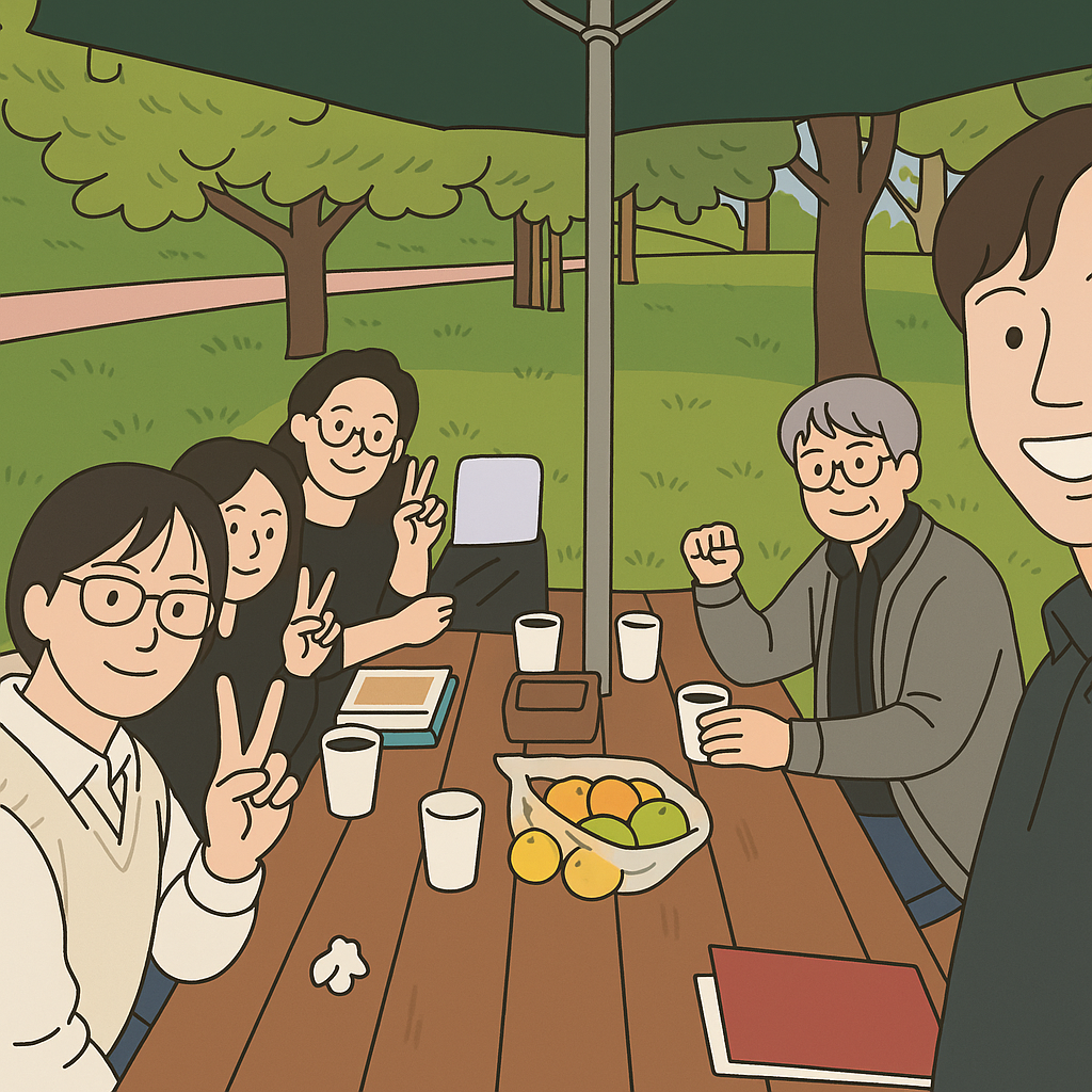 공원 테이블에 앉아 돌아가면 시를 낭독하고 이야기를 나누었다.