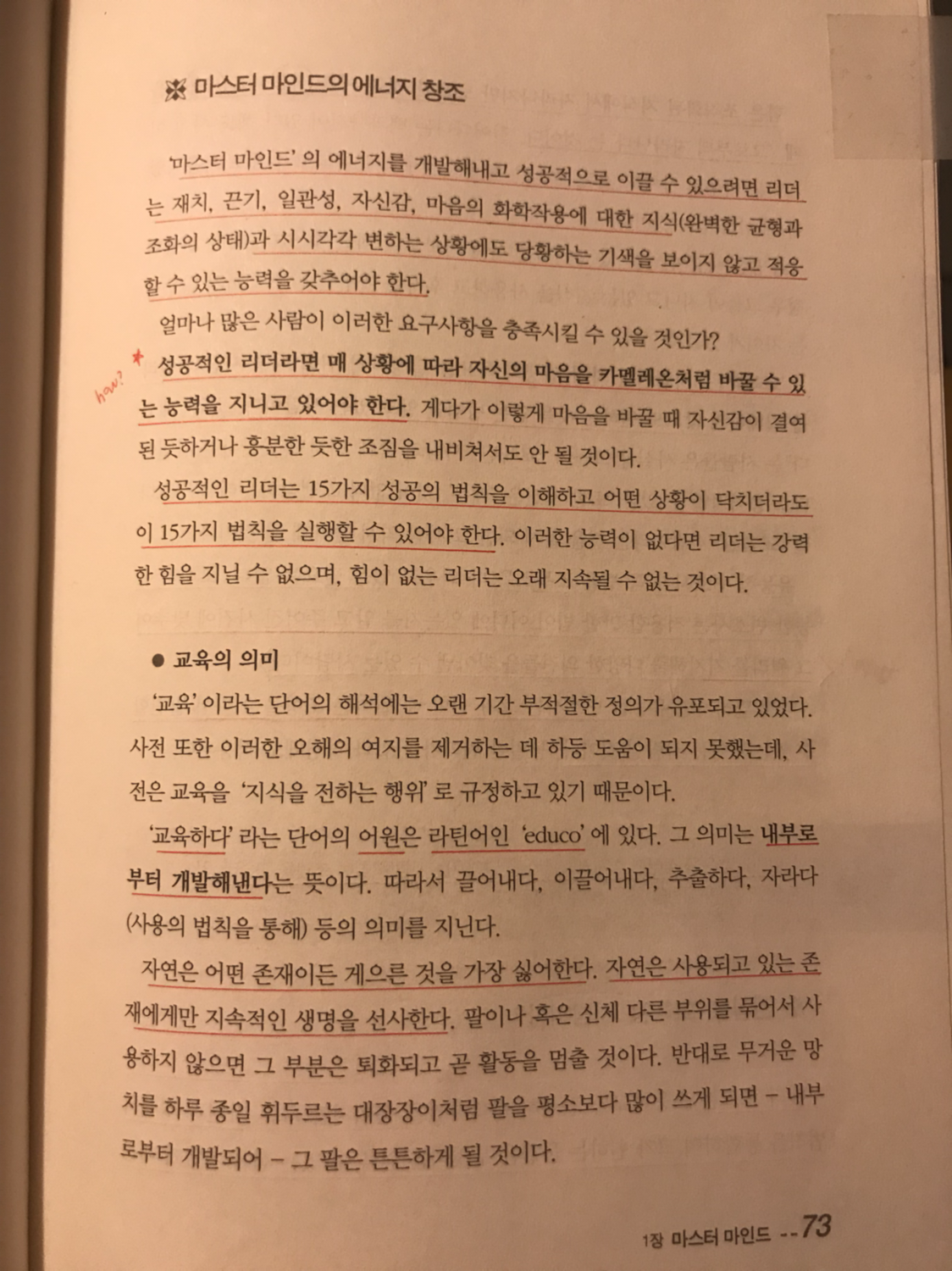‘마스터 마인드’의 에너지를 개발해내고 성공적으로 이끌 수 있으려면 리더는 재치, 끈기, 일관성, 자신감, 마음의 화학작용에 대한 지식(완벽한 균형과 조화의 상태)과 시시각각 변하는지 상황에도 당황하는 기색을 보이지 않고 적응할 수 있는 능력을 갖추어야 한다.