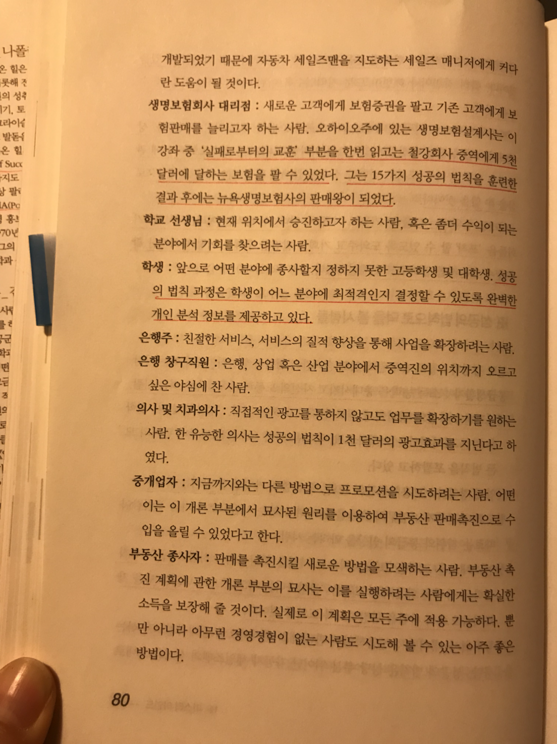 생명보험회사 대리점 : 실패로부터의 교훈 부분을 한 번 읽고는 철강회사 중역에게 5천 달러에 달하는 보험을 판매할 수 있었다. 그는 15가지 성공의 법칙을 훈련한 결과 후에는 뉴욕생명보험사의 판매왕이 되었다.